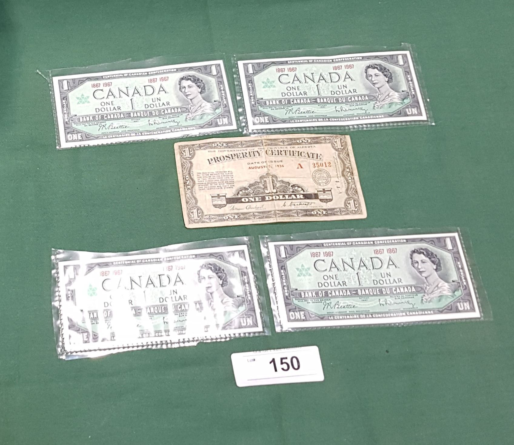 4 1967 $1 BILLS & 1936 $1 PROPERTY CERTIFICATE