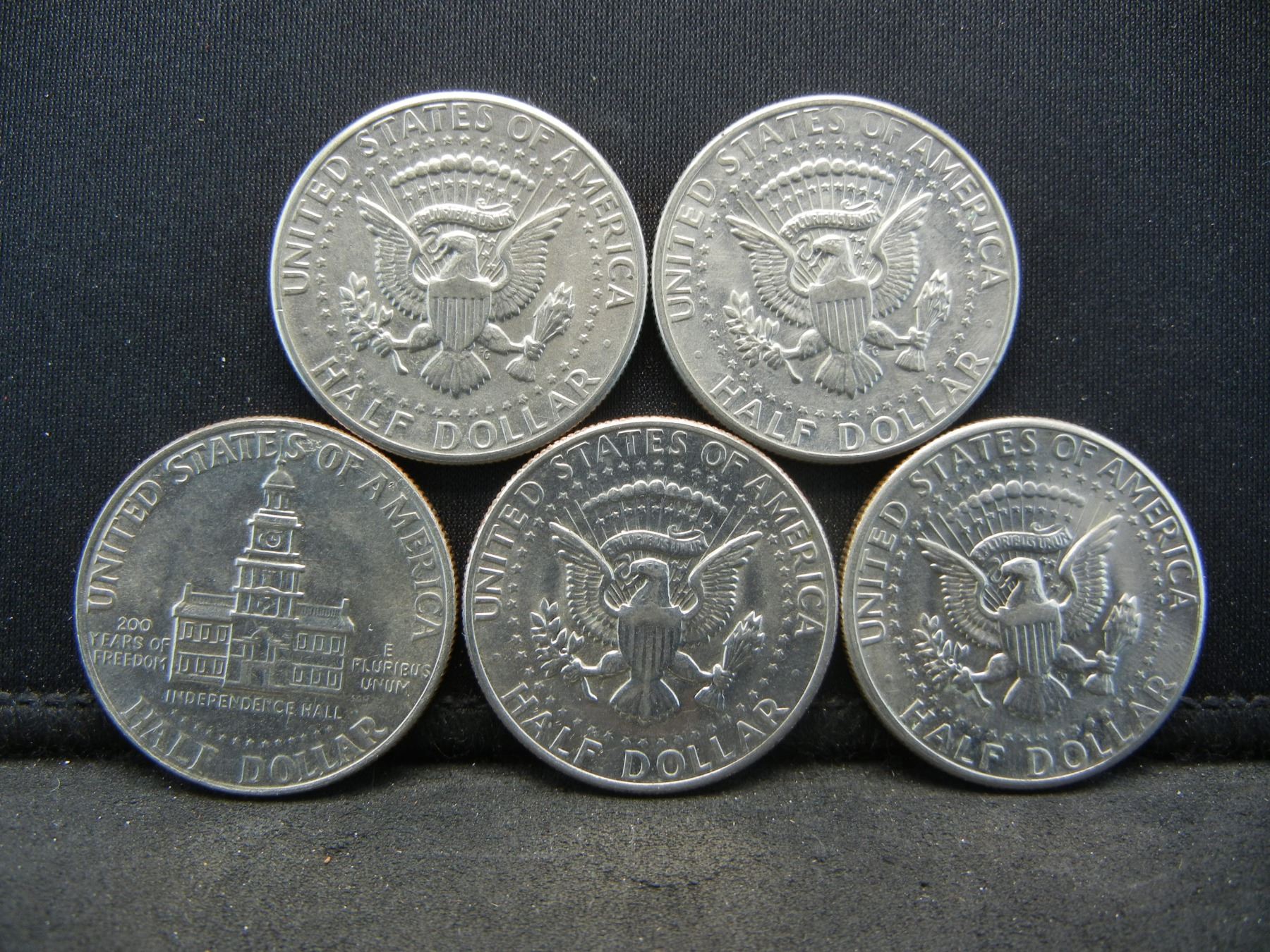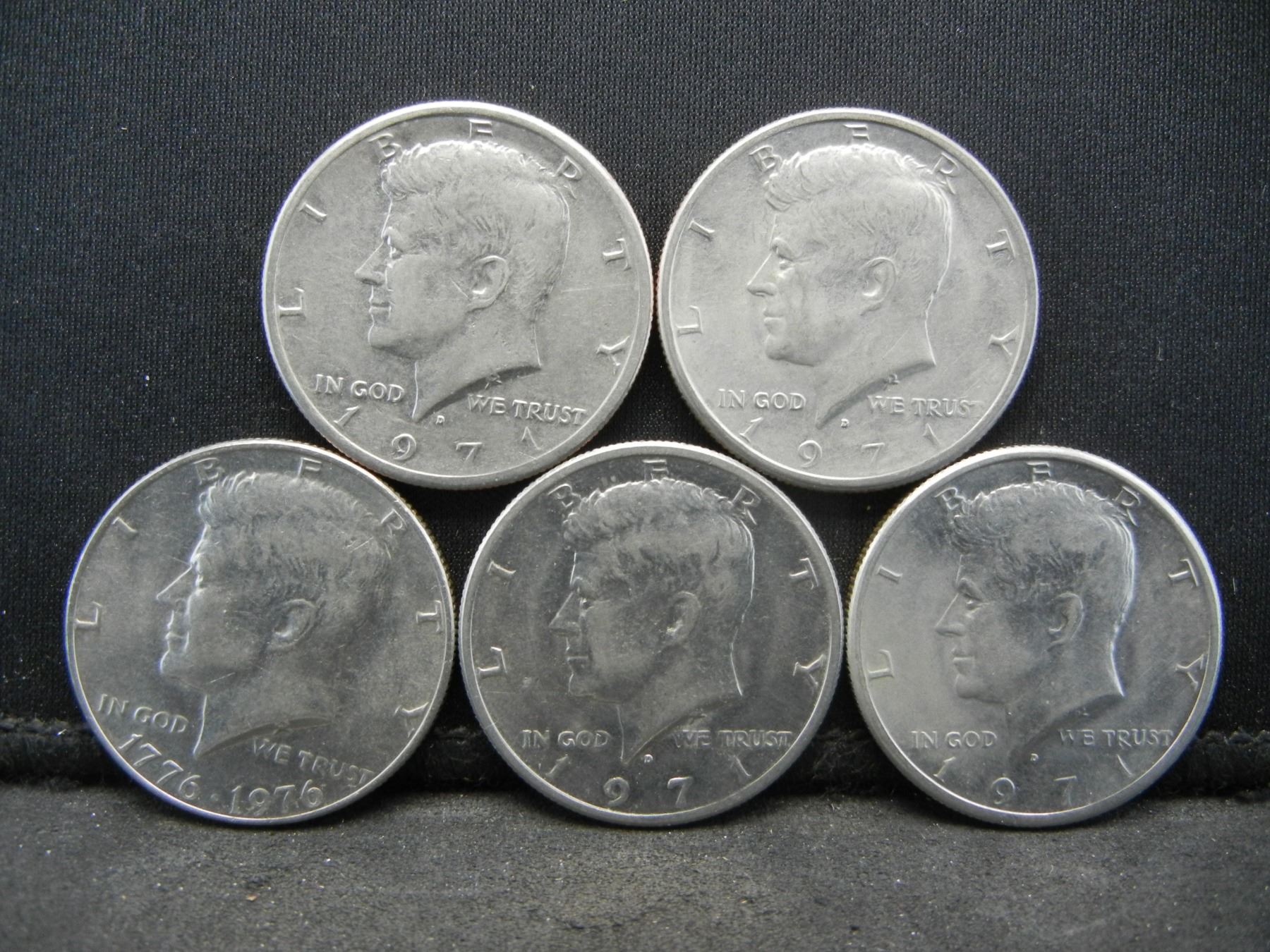 (4) 1971, (1) 1976 Kennedy Half Dollars, Some Mint Marks