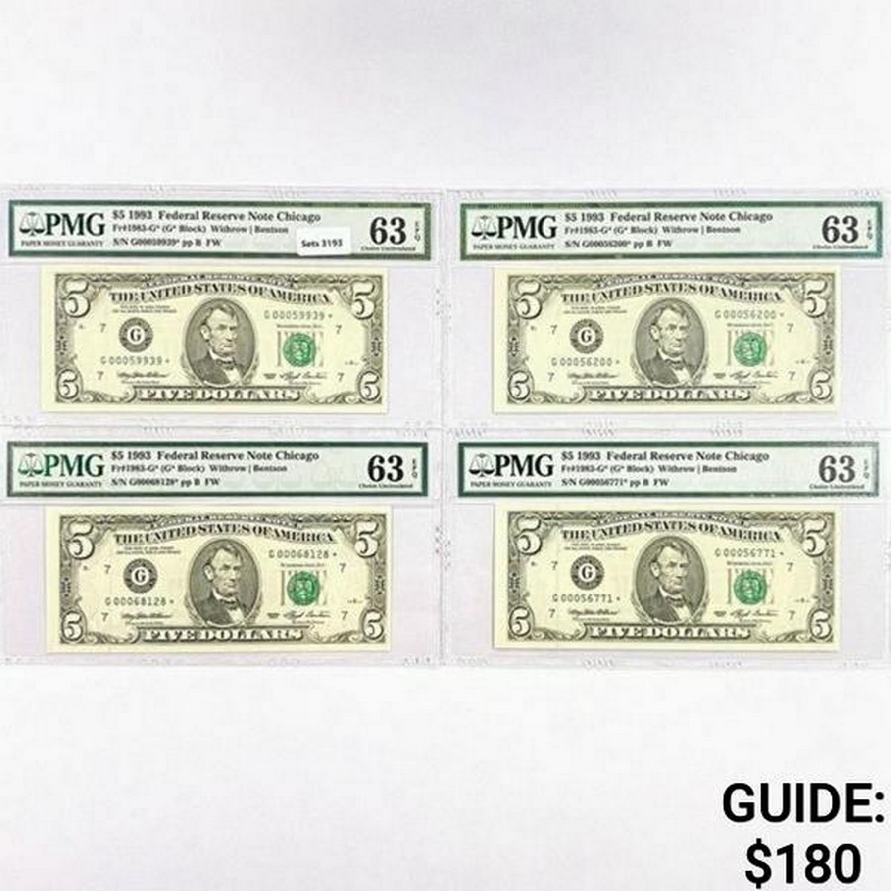 (4) 1993 Star $5 Fed Reserve Notes PMG Ch UNC 63