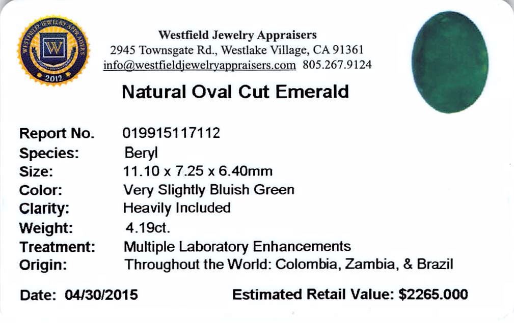 One oval cut natural emerald, measuring 11.10 x 7.25 x 6.40mm, exact weight 4.19ct., clarity is heavily included, type III, medium dark, very slightly grayish, very slightly bluish green color, (GIA vslbG 6/3), cut is good. Westfield Appraised at $2,265.00.