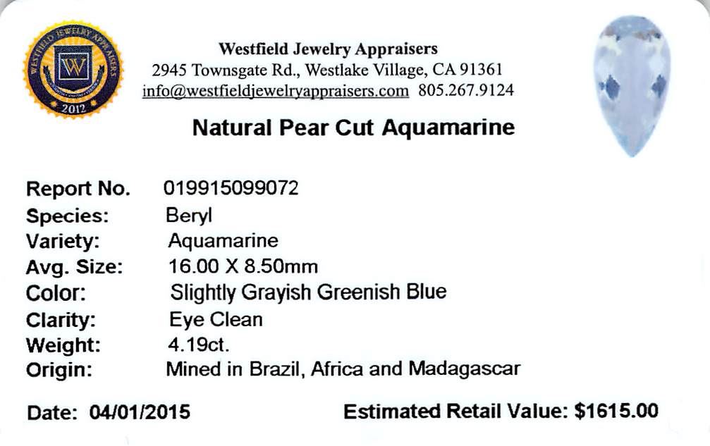 One pear cut natural aquamarine exact weight 4.19ct., clarity is eye clean, type I, medium, slightly grayish, very slightly greenish blue color, (GIA vslgB 5/2), cut is good. Westfield Appraised at $1,615.00.