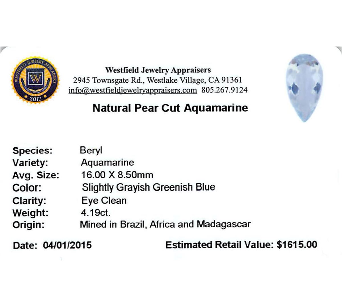 One pear cut natural aquamarine exact weight 4.19ct., clarity is eye clean, type I, medium, slightly grayish, very slightly greenish blue color, (GIA vslgB 5/2), cut is good. Westfield Appraised at $1,615.00.
