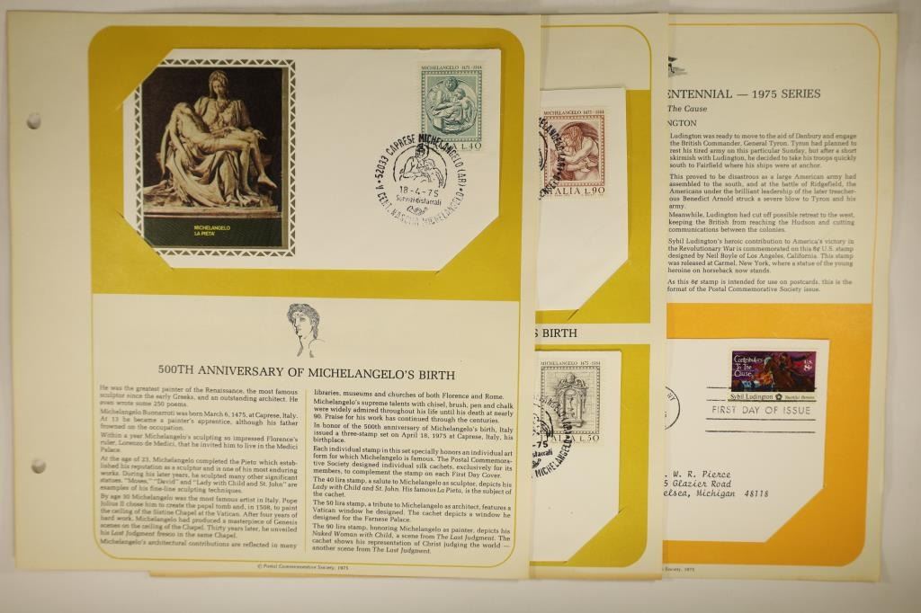 INFO SHEETS. 1975 MICHELANGELO LAW PIETA, 1975 MICHELANGELO CRISTO GIUDICE, 1975 MICHELANGELO FINESTRA DI PALAZZO FARNESE AND 1975 HONORING SYBIL LUDINGTON YOUTHFUL HEROINE OF THE REVOLUTION