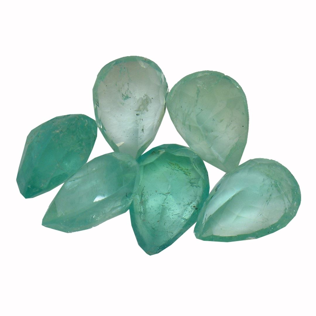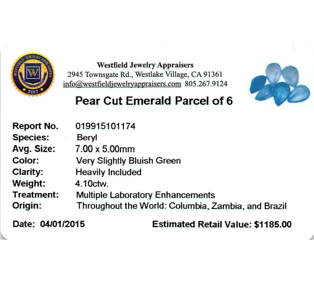 Six pear mixed cut natural emeralds exact total weight 4.10ct., clarity is severely included, type III, medium, very slightly grayish, very slightly bluish green color, (GIA vslbG 5/3), cut is good. Westfield Appraised at $1,185.00.