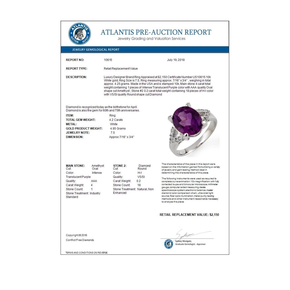 REF-32X8T -10615 ---- 4.20 CTW Amethyst & Diamond Ring 10K White Gold ---- Luxury Designer Brand Ring Appraised at $2,150 Certificate Number US10615 10k White gold, Ring Size is 7.5, Ring measuring approx. 7/16" x 3/4" , weighing in total approx. 4.25 grams. Made in the USA and is stamped 10k, Main stone 4 carat total weight containing 1 pieces of Intense Translucent Purple color with AAA quality Oval shape cut Amethyst , Stone #2 0.2 carat total weight containing 18 pieces of H-I color with VS/SI quality Round shape cut Diamond