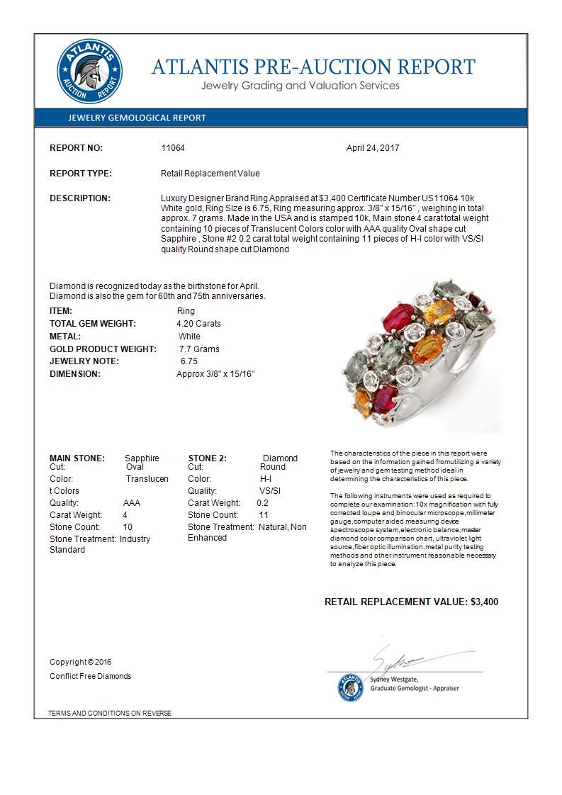 4.20 CTW Multi-Sapphire & Diamond Ring 10K White Gold ---- Luxury Designer Brand Ring Appraised Retail Price at $3,400 ---- SKU Number US11064 10k White gold Ring Size is 6.75, Ring measuring approx. 3/8" x 15/16" , weighing in total approx. 7 grams. Made in the USA and is stamped 10k, Main stone 4 carat total weight containing 10 pieces of Translucent Colors color with AAA quality Oval shape cut Sapphire , Stone #2 0.2 carat total weight containing 11 pieces of H-I color with VS/SI quality Round shape cut