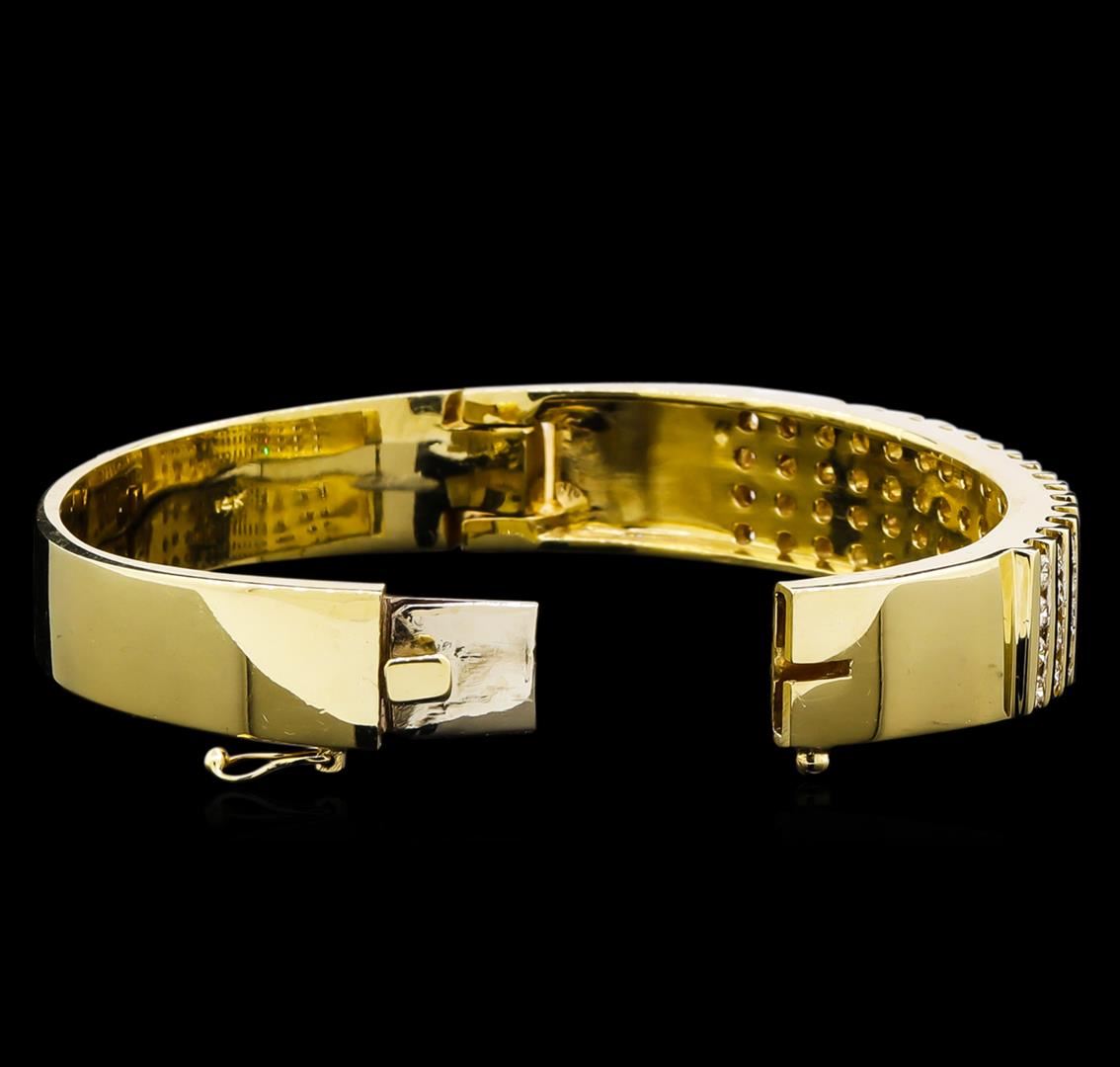 One electronically tested 14KT yellow gold ladies cast & assembled diamond bangle bracelet. The six and three-quarter inch wearable length hinged bangle bracelet features a twelve millimeter wide gallery of parallel diamond ribbons terminating in a box clasp with safety. Bright polish finish. Identified with markings of "14K". Condition is good. Containing: Sixty-Eight channel set round brilliant cut diamonds, measuring 2.65 - 2.50 x 1.55mm (depth est.) approximate total weight of 68 Stones = 4.20ct. Graded in the setting. Clarity: VS-2 to SI-1. Color: G - H. Total Weight of Diamonds 4.20ct. Total Weight of Bangle Bracelet 56.48gm. AIG Appraised at $23,350.00.