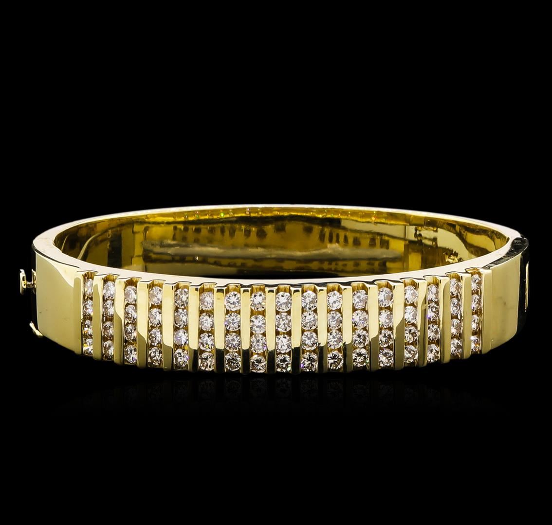 One electronically tested 14KT yellow gold ladies cast & assembled diamond bangle bracelet. The six and three-quarter inch wearable length hinged bangle bracelet features a twelve millimeter wide gallery of parallel diamond ribbons terminating in a box clasp with safety. Bright polish finish. Identified with markings of "14K". Condition is good. Containing: Sixty-Eight channel set round brilliant cut diamonds, measuring 2.65 - 2.50 x 1.55mm (depth est.) approximate total weight of 68 Stones = 4.20ct. Graded in the setting. Clarity: VS-2 to SI-1. Color: G - H. Total Weight of Diamonds 4.20ct. Total Weight of Bangle Bracelet 56.48gm. AIG Appraised at $23,350.00.