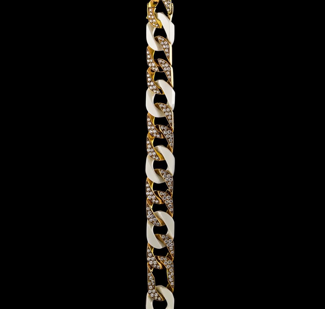 One electronically tested 18KT yellow gold lady's combination cast & assembled fashion bracelet with a tongue clasp with foldover safety with a bright polish finish. The featured ladies bracelet has 5 ceramic white links intertwined with a length of 7 inches. Condition is used, good workmanship. Containing: One Hundred Fifty-Two bead set round brilliant cut diamonds, measuring 2.10 - 1.80 x 1.19mm (depth est.) approximate total weight of 152 Stones = 4.20ct. Graded in the setting. Clarity: VS-1 to VS-2. Color: F - G. Cut Very Good. Total Weight of Diamonds 4.20ct. Total Weight of Bracelet 47.50gm. GAS Appraised at $20,350.00.