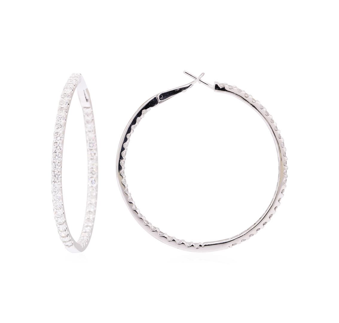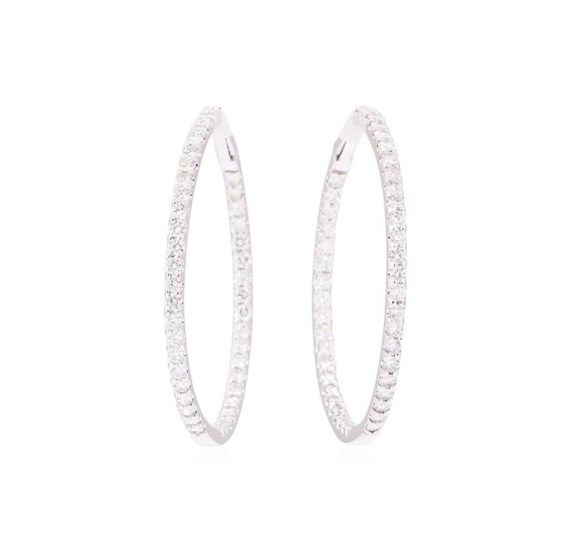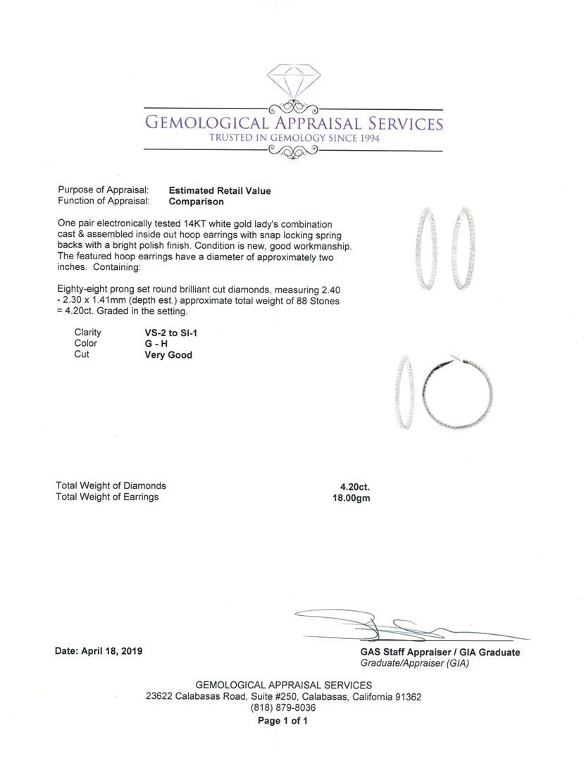 One pair electronically tested 14KT white gold lady's combination cast & assembled inside out hoop earrings with snap locking spring backs with a bright polish finish. The featured hoop earrings have a diameter of approximately two inches. Condition is new, good workmanship. Containing: Eighty-Eight prong set round brilliant cut diamonds, measuring 2.40 - 2.30 x 1.41mm (depth est.) approximate total weight of 88 Stones = 4.20ct. Graded in the setting. Color G - H Clarity VS-2 to SI-1 Cut Very Good. Total Weight of Diamonds 4.20ct.. Total Weight of Earrings 18.00gm GAS Appraised at $13210.00. GAS Appraised at $13,210.00.