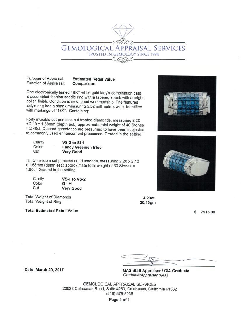 One electronically tested 18KT white gold lady's combination cast & assembled fashion saddle ring with a tapered shank with a bright polish finish. The featured lady's ring has a shank measuring 5.52 millimeters wide. Identified with markings of '18K'. Co GAS Appraised at $7,915.00.