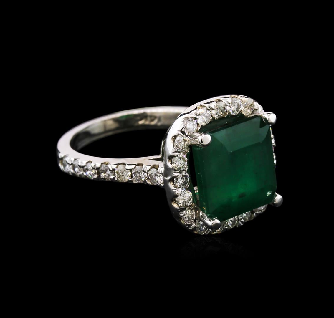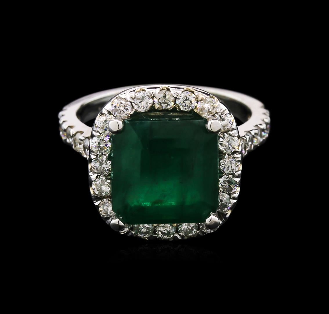 One electronically tested 14KT white gold lady's cast fashion ring with a halo with a bright polish finish. The featured lady's ring has a shank measuring 2.20 millimeters wide. Identified with markings of "14K". Condition is new, good workmanship. Containing: One prong set square step cut natural emerald, measuring 9.60 x 9.48 x 5.74mm, 15% bulge factor, approximate weight of 4.20ct., clarity is heavily included, type III, medium dark, moderately strong, green color, (GIA G 6/4), cut is good. Transmitting light somewhat diffusely, transparent to translucent. Naturally occurring internal & external characteristics are present. Indications of oil residue. Graded in the setting. Thirty-Four prong set round brilliant cut diamonds, measuring 1.90 - 1.85 x 1.22mm (depth est.) approximate total weight of 34 Stones = 0.90ct. Graded in the setting. Clarity: SI-2 to I-1. Color: H - I. Cut Good. Total Weight of Colored Stones 4.20ct. Total Weight of Diamonds 0.90ct. Total Weight of Ring 5.70gm. GAS Appraised at $5,830.00.