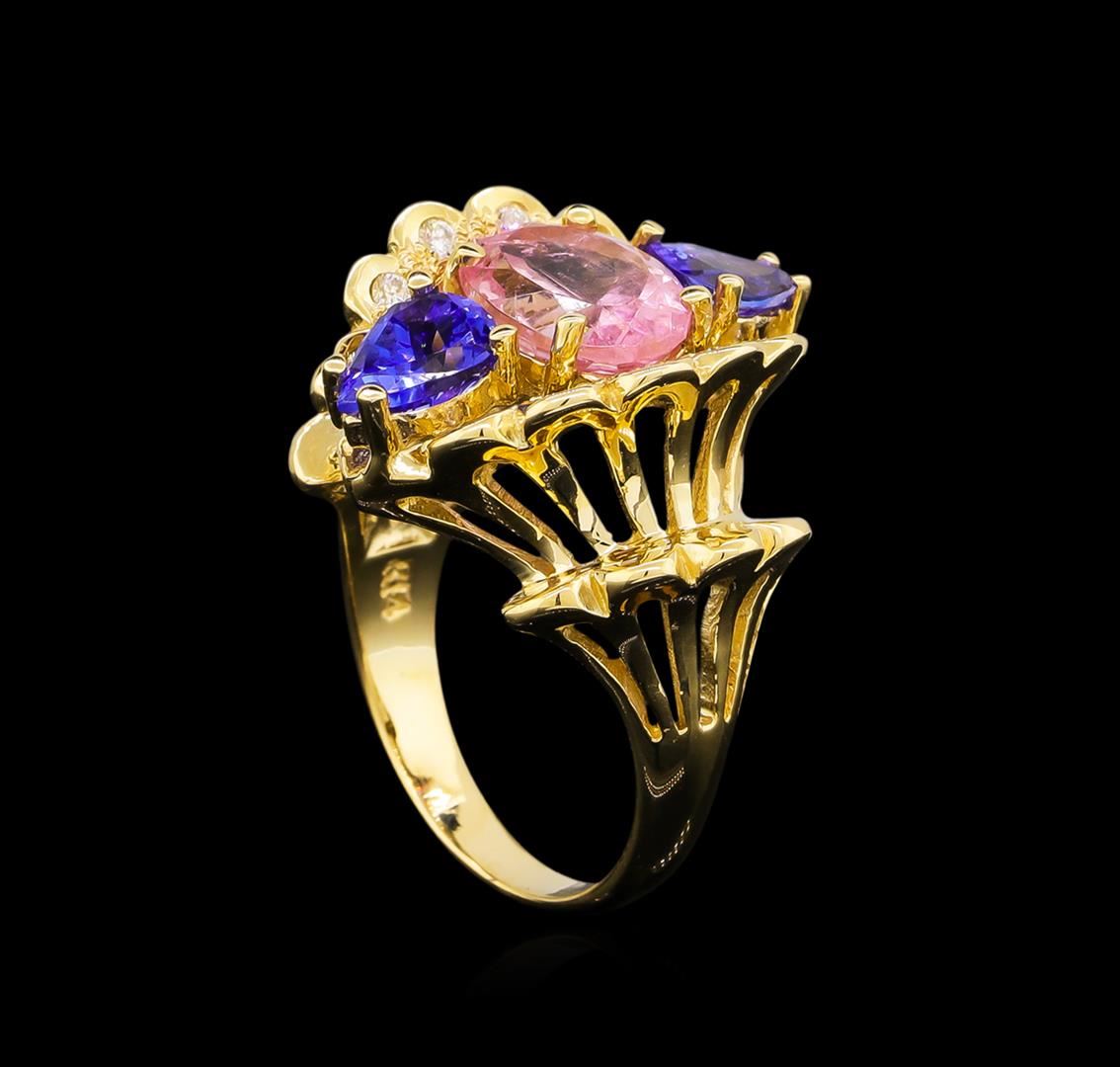One ring featuring: 14KT yellow gold weighing 8.65 grams containing one pink topaz with a total weight of 2.65ct and two tanzanites with a total weight of 1.55ct and side diamonds with a total weight of 0.26ct.