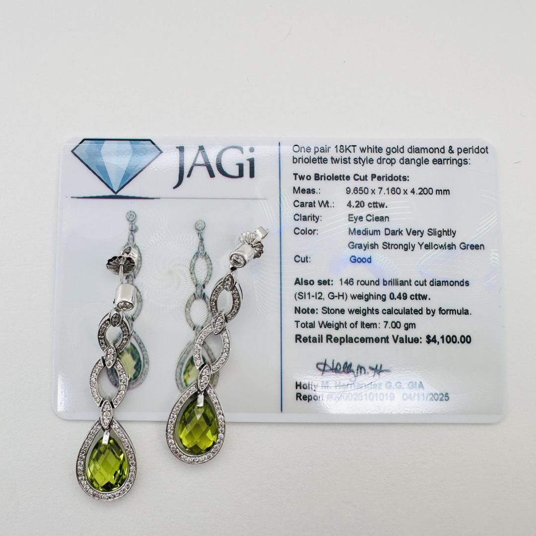 One pair of 18KT white gold twist-style dangle earrings featuring two briolette cut peridots totaling 4.20 carats, each measuring approximately 9.65 x 7.16 x 4.20 mm. The peridots are eye clean with a medium dark, slightly grayish, strongly yellowish green hue and good cut. Also set are 146 round brilliant cut diamonds (SI1-I2, G-H) weighing approximately 0.49 carats total. The total weight of the item is 7.00 grams. Stone weights are calculated by formula and graded in the setting.