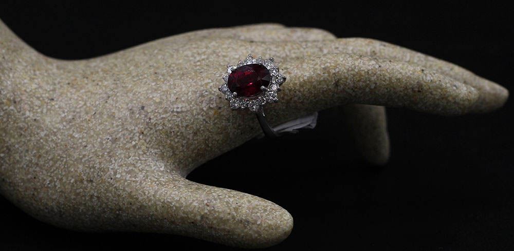 One wedding ring featuring: 14KT white gold weighing 5.18 grams containing one rhodolite garnet weighing 4.20ct and 16 diamonds weighing 0.64ctw. The garnet is oval shaped, measuring 10.50mm x 7.85mm with fine clarity and a deep red color with excellent cut. The diamonds are round brilliant cut and are natural, unenhanced stones with SI-1 clarity, G-H color and excellent cut. The ring is size 6.5 but is resizable.