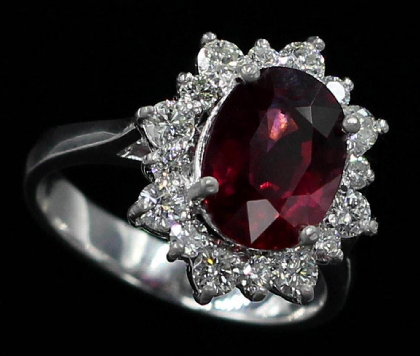 One wedding ring featuring: 14KT white gold weighing 5.18 grams containing one rhodolite garnet weighing 4.20ct and 16 diamonds weighing 0.64ctw. The garnet is oval shaped, measuring 10.50mm x 7.85mm with fine clarity and a deep red color with excellent cut. The diamonds are round brilliant cut and are natural, unenhanced stones with SI-1 clarity, G-H color and excellent cut. The ring is size 6.5 but is resizable.
