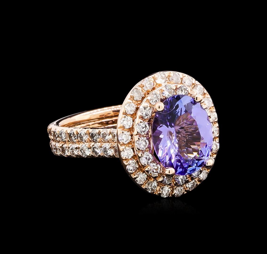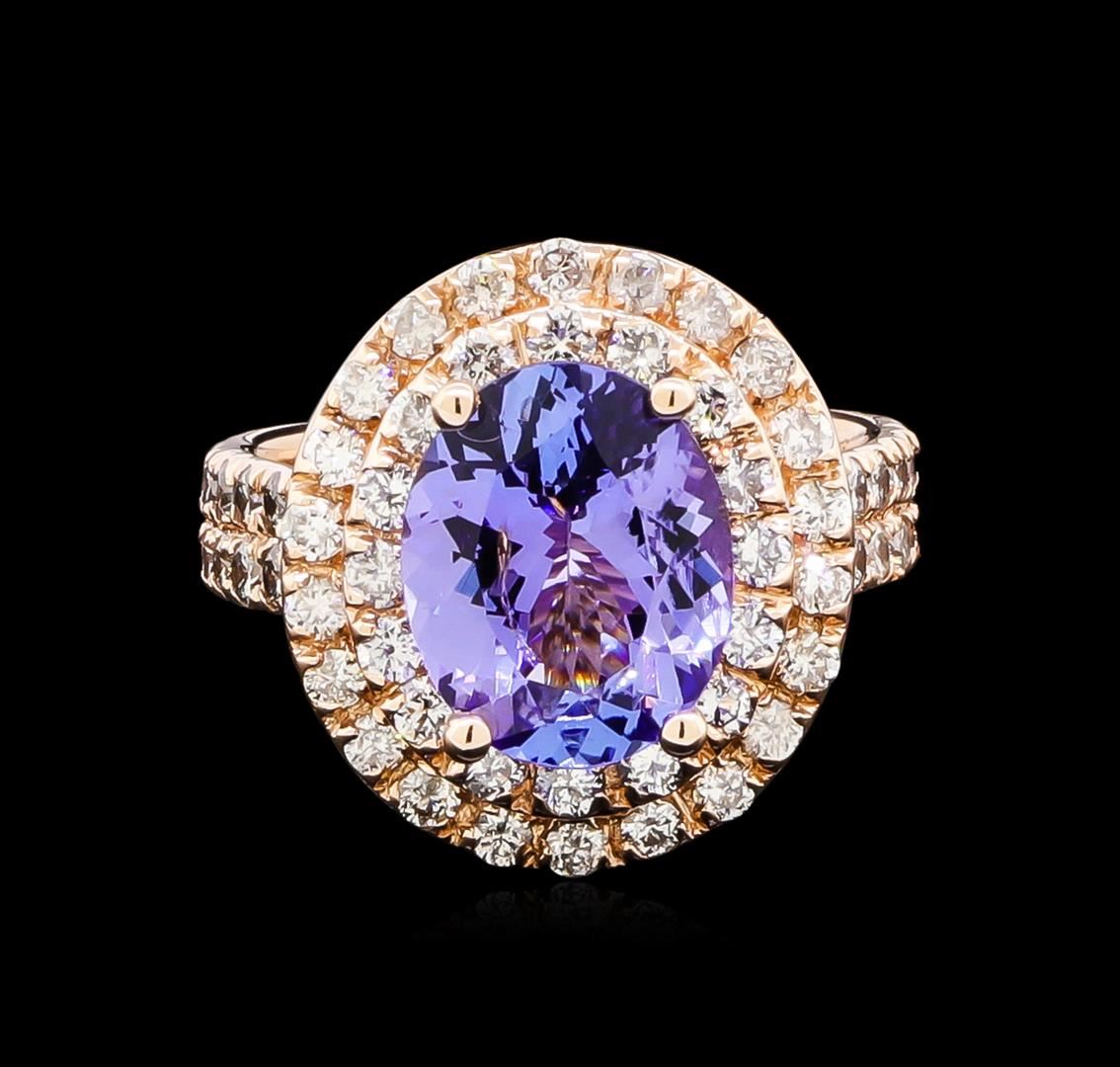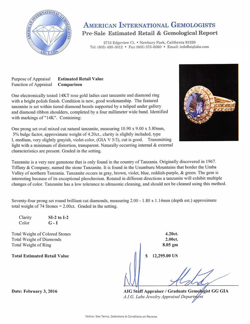 One electronically tested 14KT rose gold ladies cast tanzanite and diamond ring with a bright polish finish. The featured tanzanite is set within tiered diamond bezels supported by a tuliped under gallery and diamond ribbon shoulders, completed by a four millimeter wide band. Identified with markings of "14K". Condition is new, good workmanship. Containing: One prong set oval mixed cut natural tanzanite, measuring 10.90 x 9.00 x 5.80mm, 5%. bulge factor, approximate weight of 4.20ct., clarity is slightly included, type I, medium, very slightly grayish, violet color, (GIA V 5/3), cut is good. Transmitting light with a minimum of distortion, transparent. Naturally occurring internal & external characteristics are present. Graded in the setting. Tanzanite is a very rare gemstone that is only found in the country of Tanzania. Originally discovered in 1967. Tiffany & Company, named the stone Tanzanite. It is found in the Usumburu Mountains that border the Umba Valley of northern Tanzania. Tanzanite occurs in gray, brown, violet, blue, reddish-purple, & green. The gem is interesting because of its exceptional pleochroism. Rotated in different directions a tanzanite will exhibit multiple changes of color. Tanzanite has a low tolerance to ultrasonic cleaning, and should not be cleaned using this method. Seventy-Four prong set round brilliant cut diamonds, measuring 2.00 - 1.80 x 1.14mm (depth est.) approximate total weight of 74 Stones = 2.00ct. Graded in the setting. Clarity: SI-2 to I-2. Color: G - I. Total Weight of Colored Stones 4.20ct. Total Weight of Diamonds 2.00ct. Total Weight of Ring 8.05gm. AIG Appraised at $12,295.00.