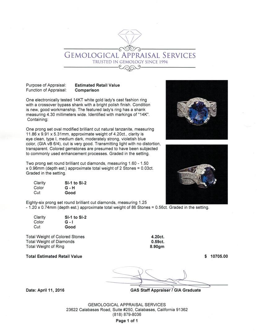 One electronically tested 14KT white gold lady's cast fashion ring with a crossover bypass shank with a bright polish finish. The featured lady's ring has a shank measuring 4.30 millimeters wide. Identified with markings of "14K". Condition is new, good workmanship. Containing: One prong set oval modified brilliant cut natural tanzanite, measuring 11.86 x 9.91 x 5.31mm, approximate weight of 4.20ct., clarity is eye clean, type I, medium dark, moderately strong, violetish blue color, (GIA vB 6/4), cut is very good. Transmitting light with no distortion, transparent. Colored gemstones are presumed to have been subjected to commonly used enhancement processes. Graded in the setting. Two prong set round brilliant cut diamonds, measuring 1.60 - 1.50 x 0.96mm (depth est.) approximate total weight of 2 Stones = 0.03ct. Graded in the setting. Clarity: SI-1 to SI-2. Color: G - H. Cut Good Eighty-Six prong set round brilliant cut diamonds, measuring 1.25 - 1.20 x 0.74mm (depth est.) approximate total weight of 86 Stones = 0.56ct. Graded in the setting. Clarity: SI-1 to SI-2. Color: G - I. Cut Good. Total Weight of Colored Stones 4.20ct. Total Weight of Diamonds 0.59ct. Total Weight of Ring 8.90gm. GAS Appraised at $10,705.00.