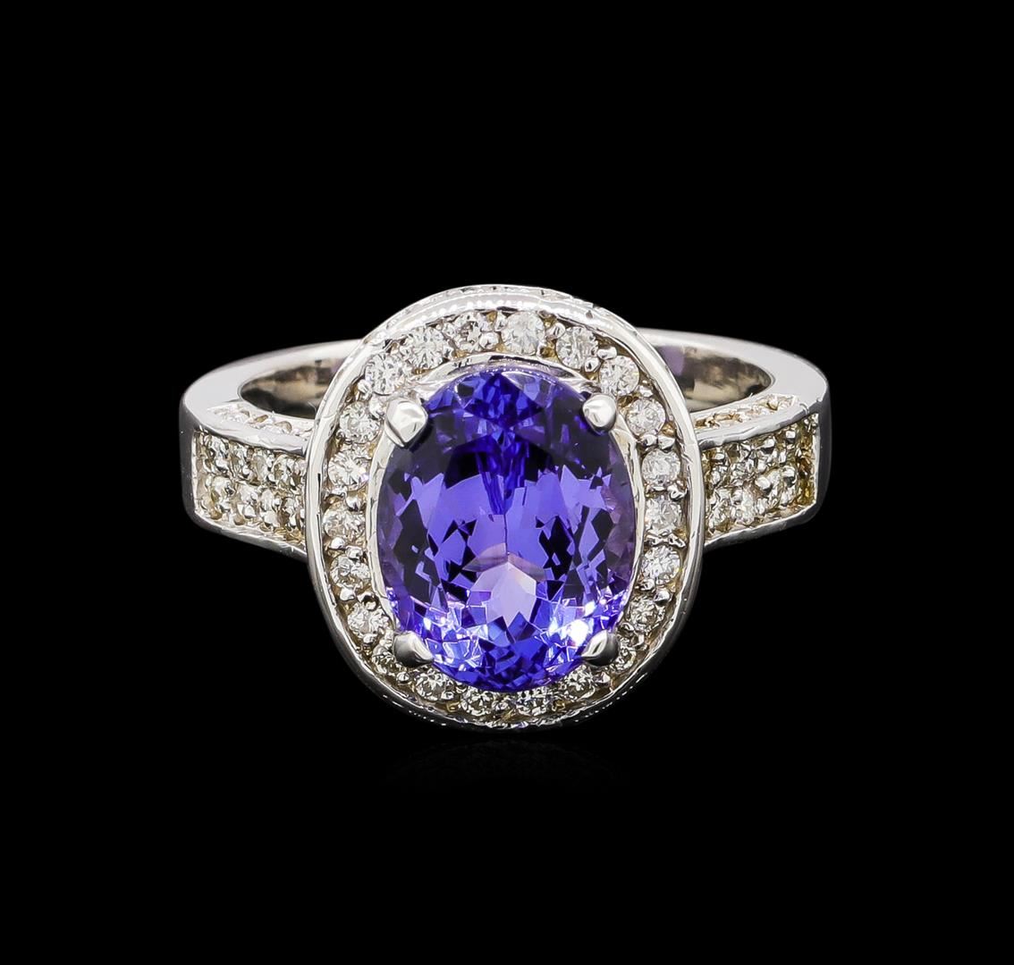 One electronically tested 14KT white gold lady's cast fashion ring with a split shank halo with a bright polish finish. The featured lady's ring has a double shank measuring 2.80 millimeters wide. Identified with markings of '14K'. Condition is new, good workmanship. Containing: One prong set oval modified brilliant cut natural tanzanite, measuring 10.68 x 8.84 x 6.25mm, (depth est.) approximate weight of 4.20ct., clarity is eye clean, medium, very slightly grayish, bluish violet color, (GIA bV 5/3), cut is very good. Transmitting light with no distortion, transparent. Colored gemstones are presumed to have been subjected to commonly used enhancement processes. Graded in the setting. Two bezel set round brilliant cut diamonds, measuring 2.10 - 2.05 x 1.29mm (depth est.) approximate total weight of 2 Stones = 0.07ct. Graded in the setting. Clarity SI-1 to SI-2. Color: H - I Cut Very Good Fifty-Four prong set round brilliant cut diamonds, measuring 1.40 - 1.25 x 0.82mm (depth est.) approximate total weight of 54 Stones = 0.47ct. Graded in the setting. Clarity SI-1 to SI-2. Color: H - I Cut Good Twenty-Two prong set round brilliant cut diamonds, measuring 1.20 - 1.10 x 0.69mm (depth est.) approximate total weight of 22 Stones = 0.12ct. Graded in the setting. Clarity SI-1 to I-1. Color: G - H Cut Good. Total Weight of Colored Stones 4.20ct.. Total Weight of Diamonds 0.66ct.. Total Weight of Ring 5.30gm. GAS Appraised at $9,210.00.