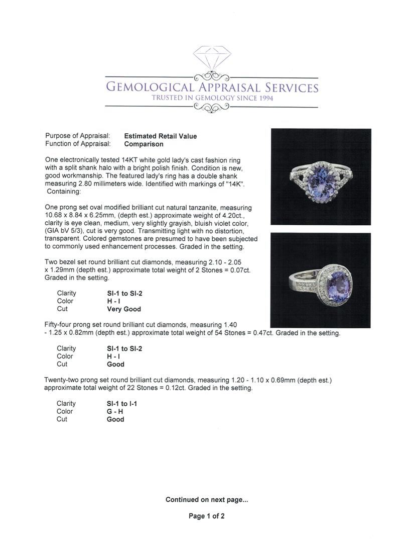 One electronically tested 14KT white gold lady's cast fashion ring with a split shank halo with a bright polish finish. The featured lady's ring has a double shank measuring 2.80 millimeters wide. Identified with markings of '14K'. Condition is new, good workmanship. Containing: One prong set oval modified brilliant cut natural tanzanite, measuring 10.68 x 8.84 x 6.25mm, (depth est.) approximate weight of 4.20ct., clarity is eye clean, medium, very slightly grayish, bluish violet color, (GIA bV 5/3), cut is very good. Transmitting light with no distortion, transparent. Colored gemstones are presumed to have been subjected to commonly used enhancement processes. Graded in the setting. Two bezel set round brilliant cut diamonds, measuring 2.10 - 2.05 x 1.29mm (depth est.) approximate total weight of 2 Stones = 0.07ct. Graded in the setting. Clarity SI-1 to SI-2. Color: H - I Cut Very Good Fifty-Four prong set round brilliant cut diamonds, measuring 1.40 - 1.25 x 0.82mm (depth est.) approximate total weight of 54 Stones = 0.47ct. Graded in the setting. Clarity SI-1 to SI-2. Color: H - I Cut Good Twenty-Two prong set round brilliant cut diamonds, measuring 1.20 - 1.10 x 0.69mm (depth est.) approximate total weight of 22 Stones = 0.12ct. Graded in the setting. Clarity SI-1 to I-1. Color: G - H Cut Good. Total Weight of Colored Stones 4.20ct.. Total Weight of Diamonds 0.66ct.. Total Weight of Ring 5.30gm. GAS Appraised at $9,210.00.