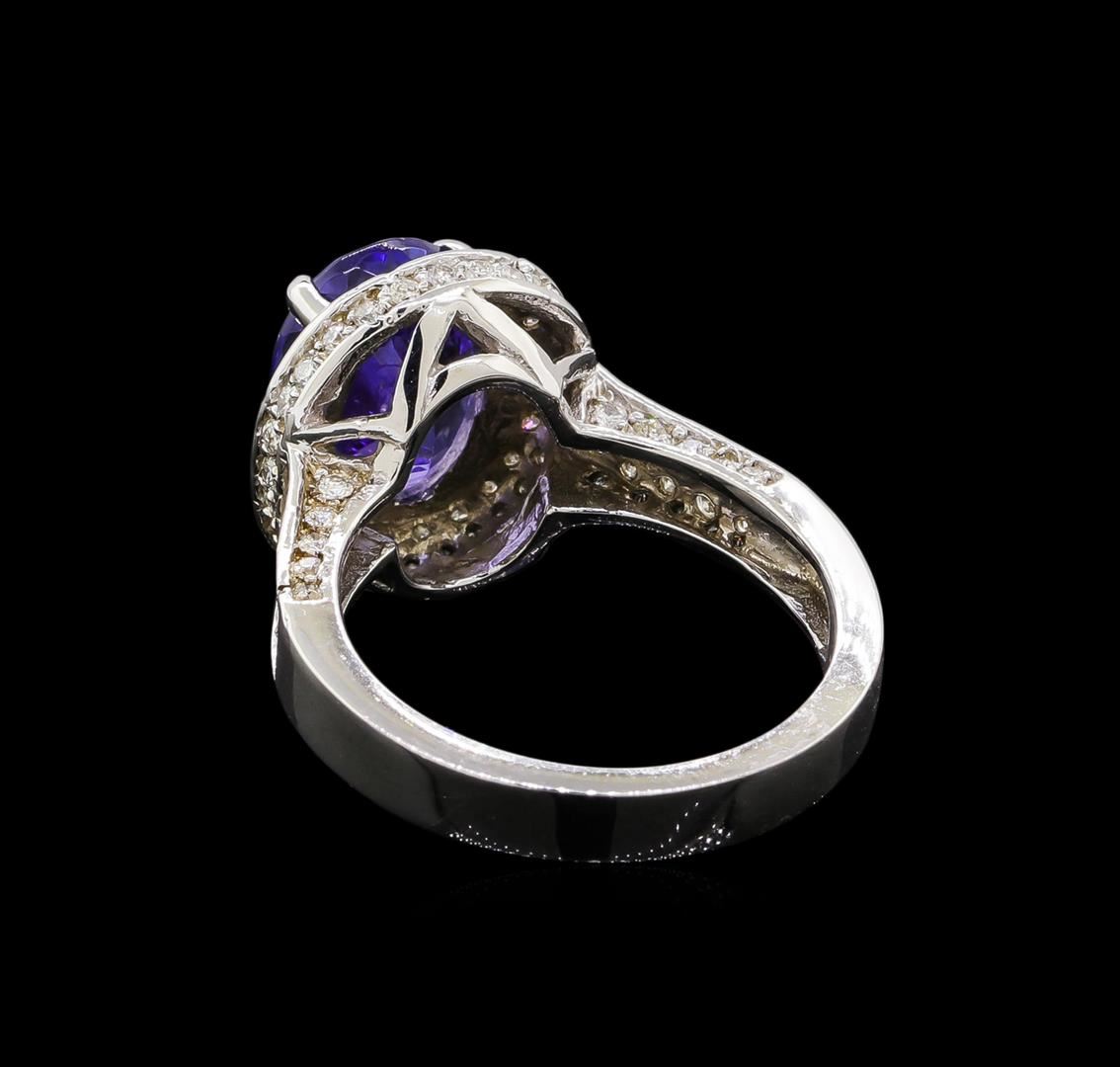 One electronically tested 14KT white gold lady's cast fashion ring with a split shank halo with a bright polish finish. The featured lady's ring has a double shank measuring 2.80 millimeters wide. Identified with markings of '14K'. Condition is new, good workmanship. Containing: One prong set oval modified brilliant cut natural tanzanite, measuring 10.68 x 8.84 x 6.25mm, (depth est.) approximate weight of 4.20ct., clarity is eye clean, medium, very slightly grayish, bluish violet color, (GIA bV 5/3), cut is very good. Transmitting light with no distortion, transparent. Colored gemstones are presumed to have been subjected to commonly used enhancement processes. Graded in the setting. Two bezel set round brilliant cut diamonds, measuring 2.10 - 2.05 x 1.29mm (depth est.) approximate total weight of 2 Stones = 0.07ct. Graded in the setting. Clarity SI-1 to SI-2. Color: H - I Cut Very Good Fifty-Four prong set round brilliant cut diamonds, measuring 1.40 - 1.25 x 0.82mm (depth est.) approximate total weight of 54 Stones = 0.47ct. Graded in the setting. Clarity SI-1 to SI-2. Color: H - I Cut Good Twenty-Two prong set round brilliant cut diamonds, measuring 1.20 - 1.10 x 0.69mm (depth est.) approximate total weight of 22 Stones = 0.12ct. Graded in the setting. Clarity SI-1 to I-1. Color: G - H Cut Good. Total Weight of Colored Stones 4.20ct.. Total Weight of Diamonds 0.66ct.. Total Weight of Ring 5.30gm. GAS Appraised at $9,210.00.
