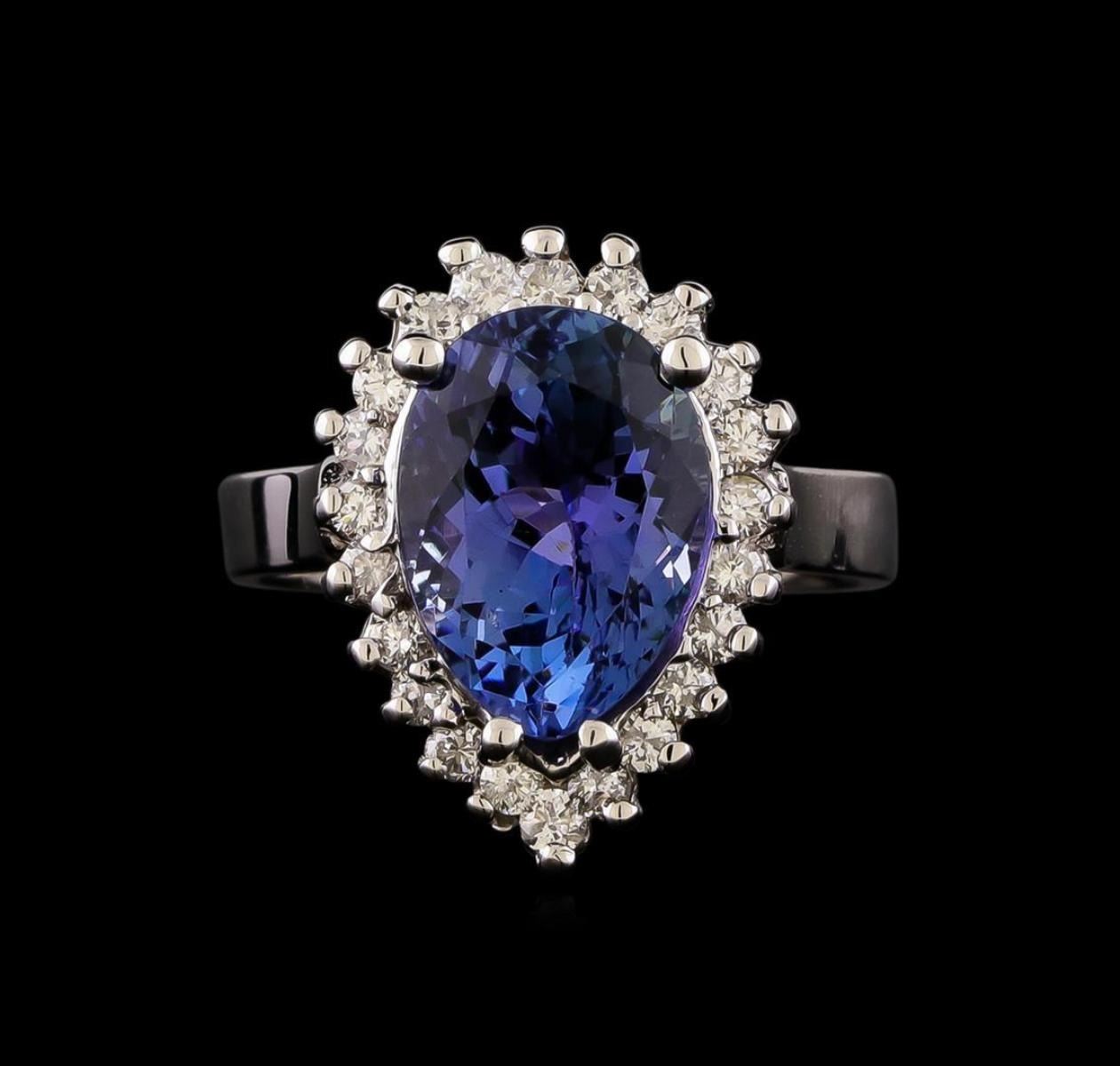 One electronically tested 14KT white gold lady's cast fashion ring with a basket halo with a bright polish finish. The featured lady's ring has a shank measuring 2.70 millimeters wide. Identified with markings of '14K'. Condition is new, good workmanship. Containing: One prong set pear modified brilliant cut natural tanzanite, measuring 11.63 x 8.44 x 6.27mm, (depth est.) approximate weight of 4.20ct., clarity is eye clean, medium, very slightly grayish, violetish blue color, (GIA vB 5/3), cut is good. Transmitting light with no distortion, transparent. Colored gemstones are presumed to have been subjected to commonly used enhancement processes. Graded in the setting. Twenty-Two prong set round brilliant cut diamonds, measuring 1.80 - 1.75 x 1.10mm (depth est.) approximate total weight of 22 Stones = 0.48ct. Graded in the setting. Clarity SI-1 to SI-2. Color: G - H Cut Good. Total Weight of Colored Stones 4.20ct.. Total Weight of Diamonds 0.48ct.. Total Weight of Ring 6.20gm.