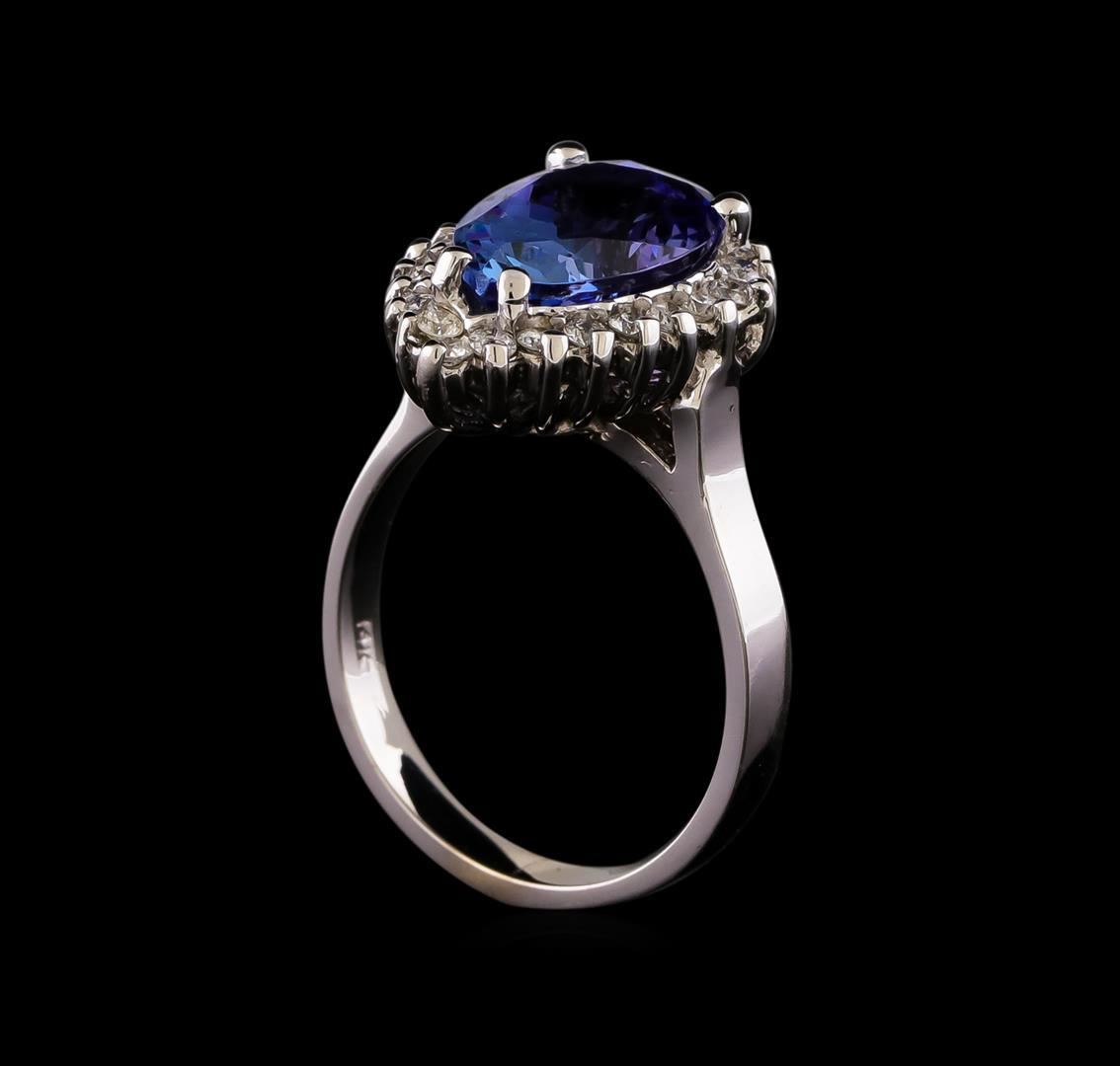 One electronically tested 14KT white gold lady's cast fashion ring with a basket halo with a bright polish finish. The featured lady's ring has a shank measuring 2.70 millimeters wide. Identified with markings of '14K'. Condition is new, good workmanship. Containing: One prong set pear modified brilliant cut natural tanzanite, measuring 11.63 x 8.44 x 6.27mm, (depth est.) approximate weight of 4.20ct., clarity is eye clean, medium, very slightly grayish, violetish blue color, (GIA vB 5/3), cut is good. Transmitting light with no distortion, transparent. Colored gemstones are presumed to have been subjected to commonly used enhancement processes. Graded in the setting. Twenty-Two prong set round brilliant cut diamonds, measuring 1.80 - 1.75 x 1.10mm (depth est.) approximate total weight of 22 Stones = 0.48ct. Graded in the setting. Clarity SI-1 to SI-2. Color: G - H Cut Good. Total Weight of Colored Stones 4.20ct.. Total Weight of Diamonds 0.48ct.. Total Weight of Ring 6.20gm.