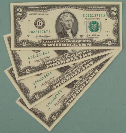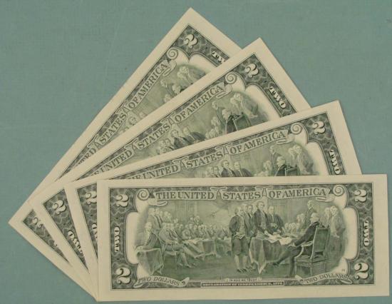 (4) 2003-A $2 Notes, with Consecutive serial numbers * * Grade: Crisp Uncirculated * Mint mark: G (Chicago) * *Bills you receive might be different from those shown.