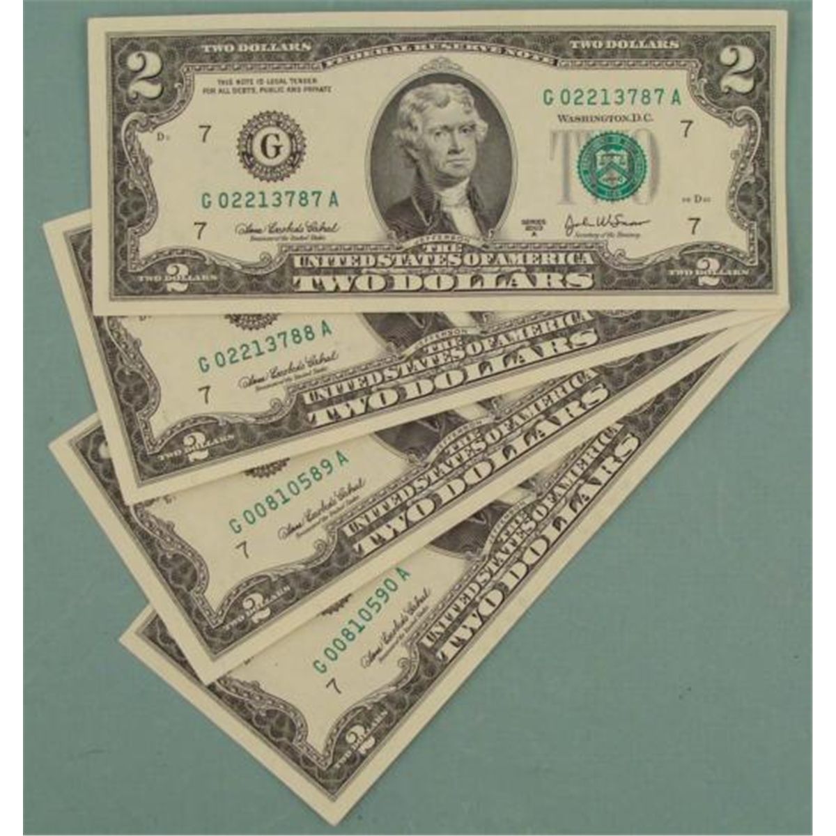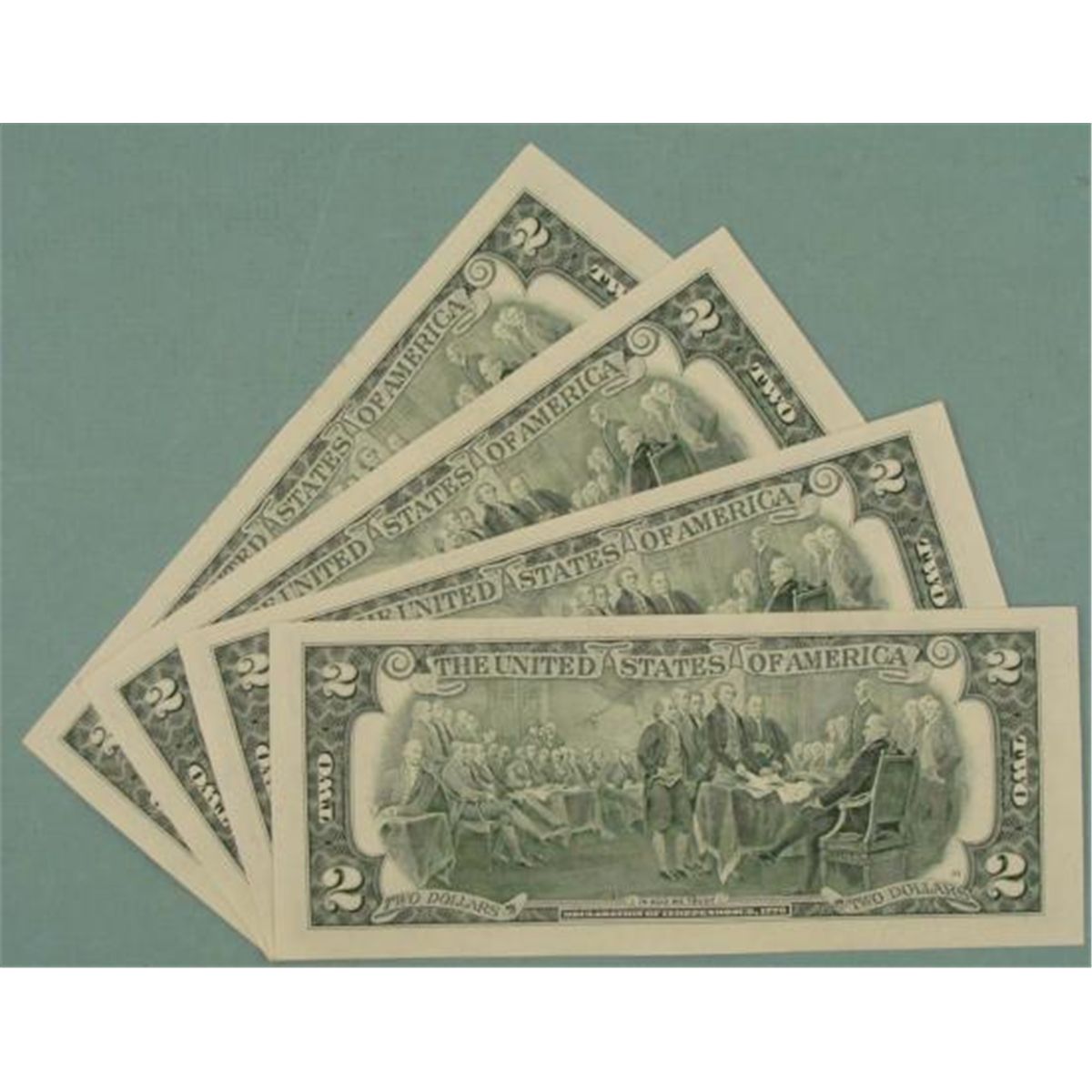 (4) 2003-A $2 Notes, with Consecutive serial numbers * * Grade: Crisp Uncirculated * Mint mark: G (Chicago) * *Bills you receive might be different from those shown.