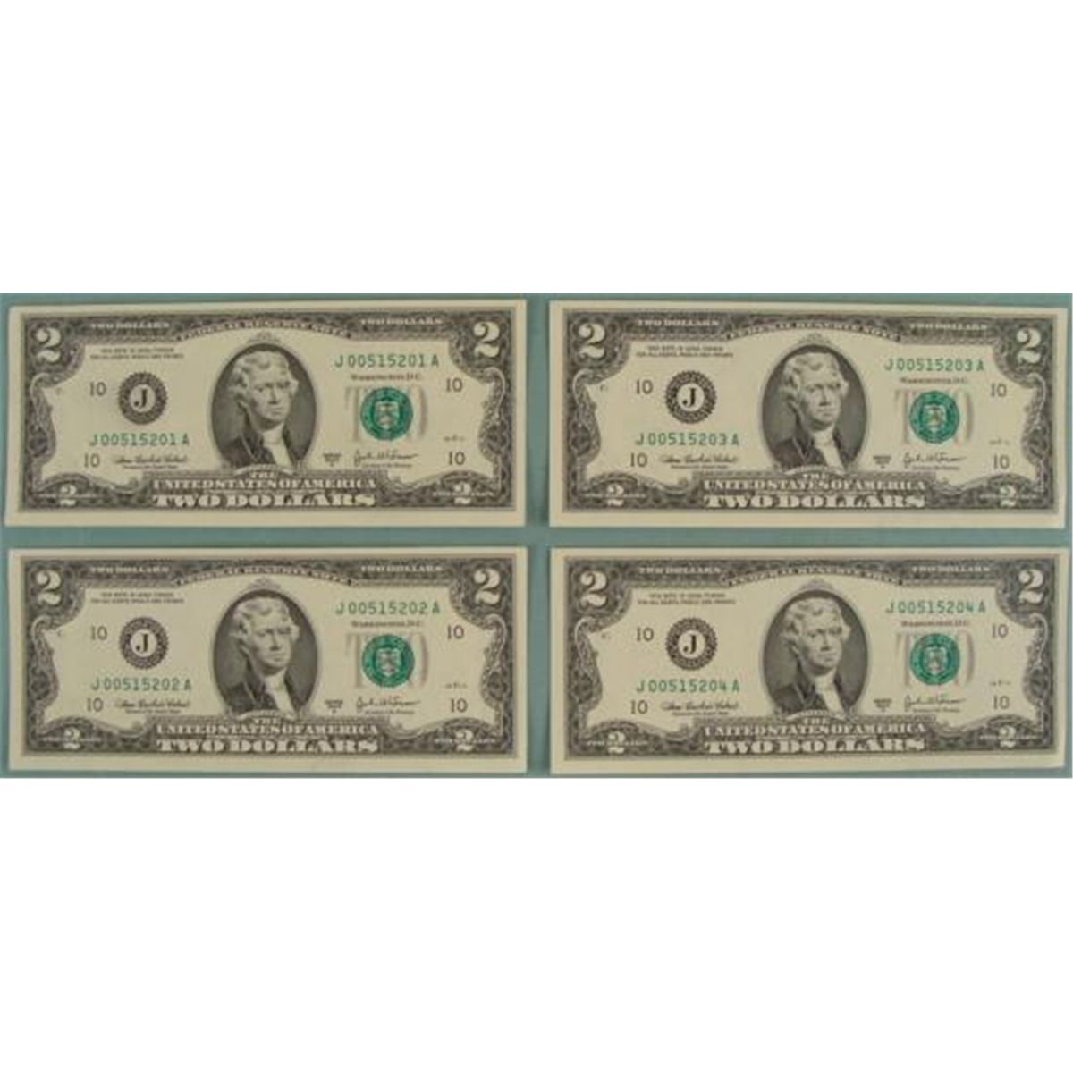 4) 2003 A $2 Notes with consecutive serial numbers * Mint mark: J (Kansas City)Condition: Crisp Uncirculated * * Bills you receive may be different from those shown *