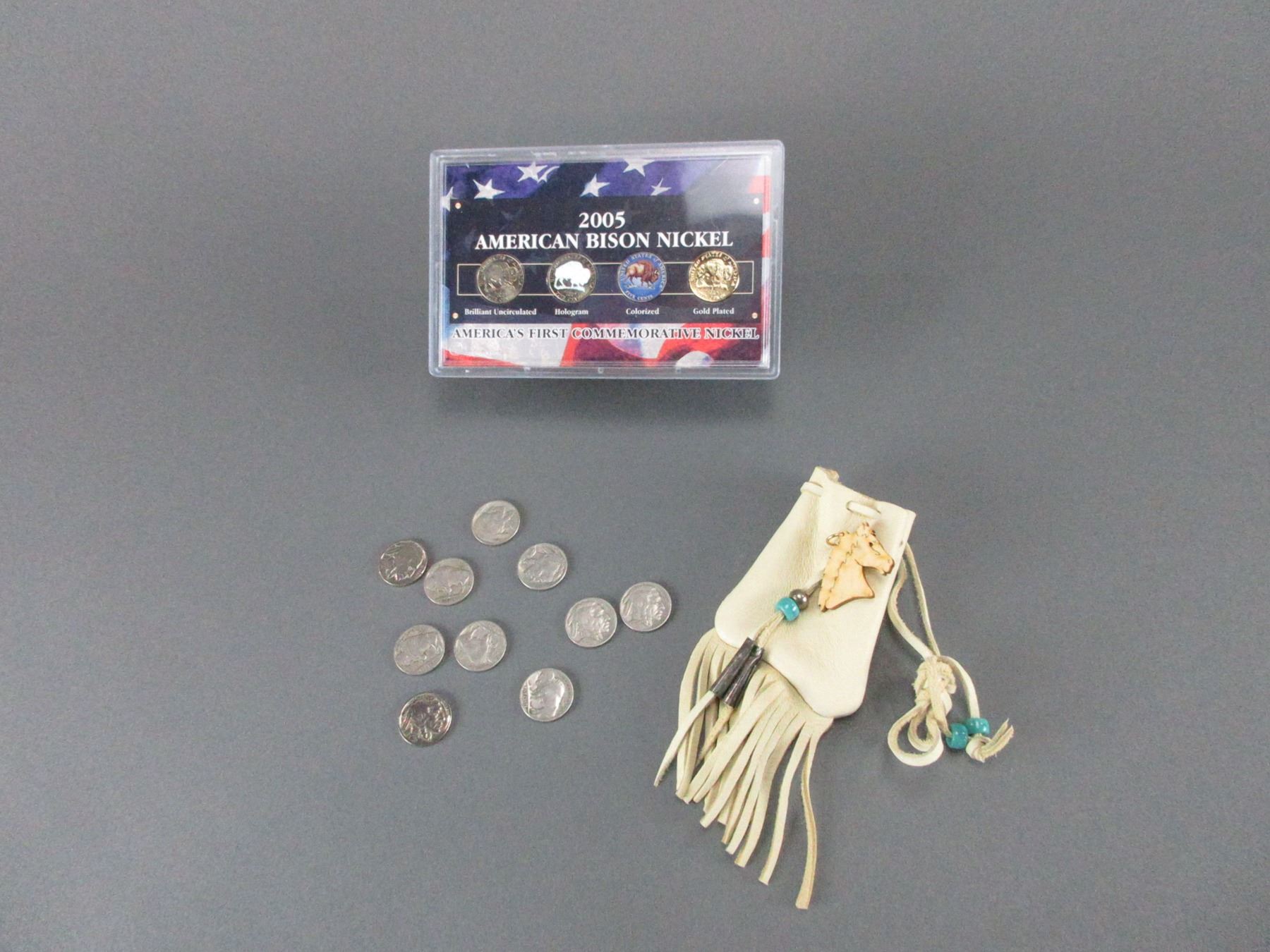 4 2005 Bison Nickels In Holder- 10 Buffalo Nickels In Beaded Leather Pouch