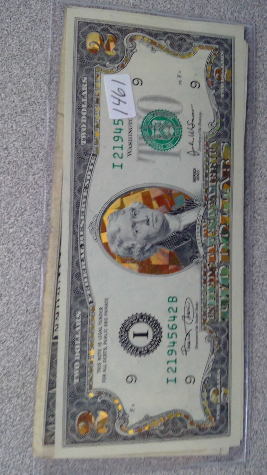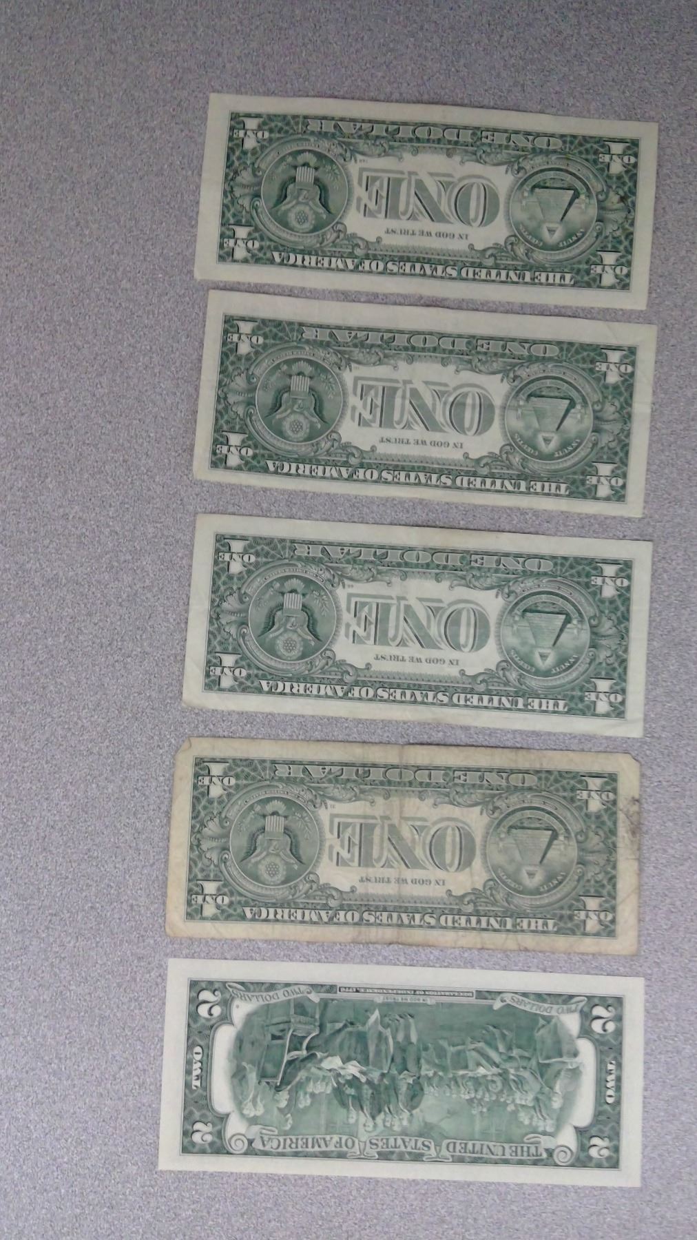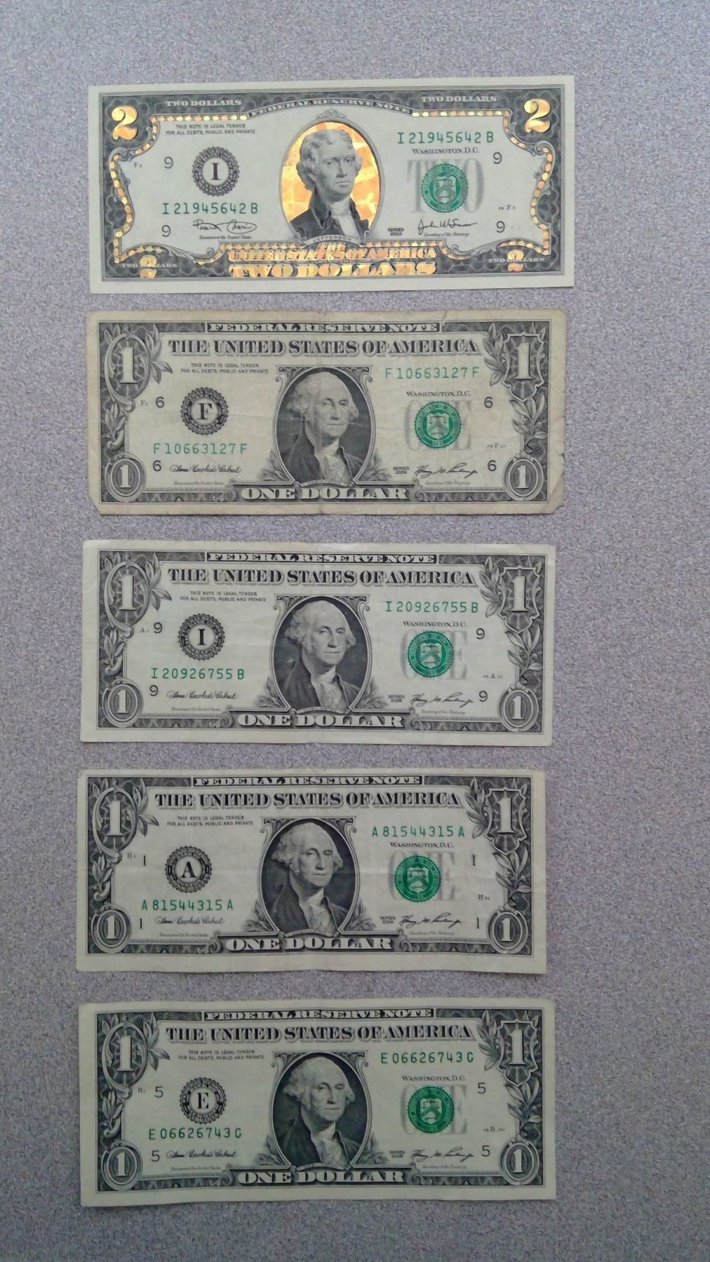 4 2006 $1 USA bills and 1 $2 USA bill 2003 in plastic sleeve