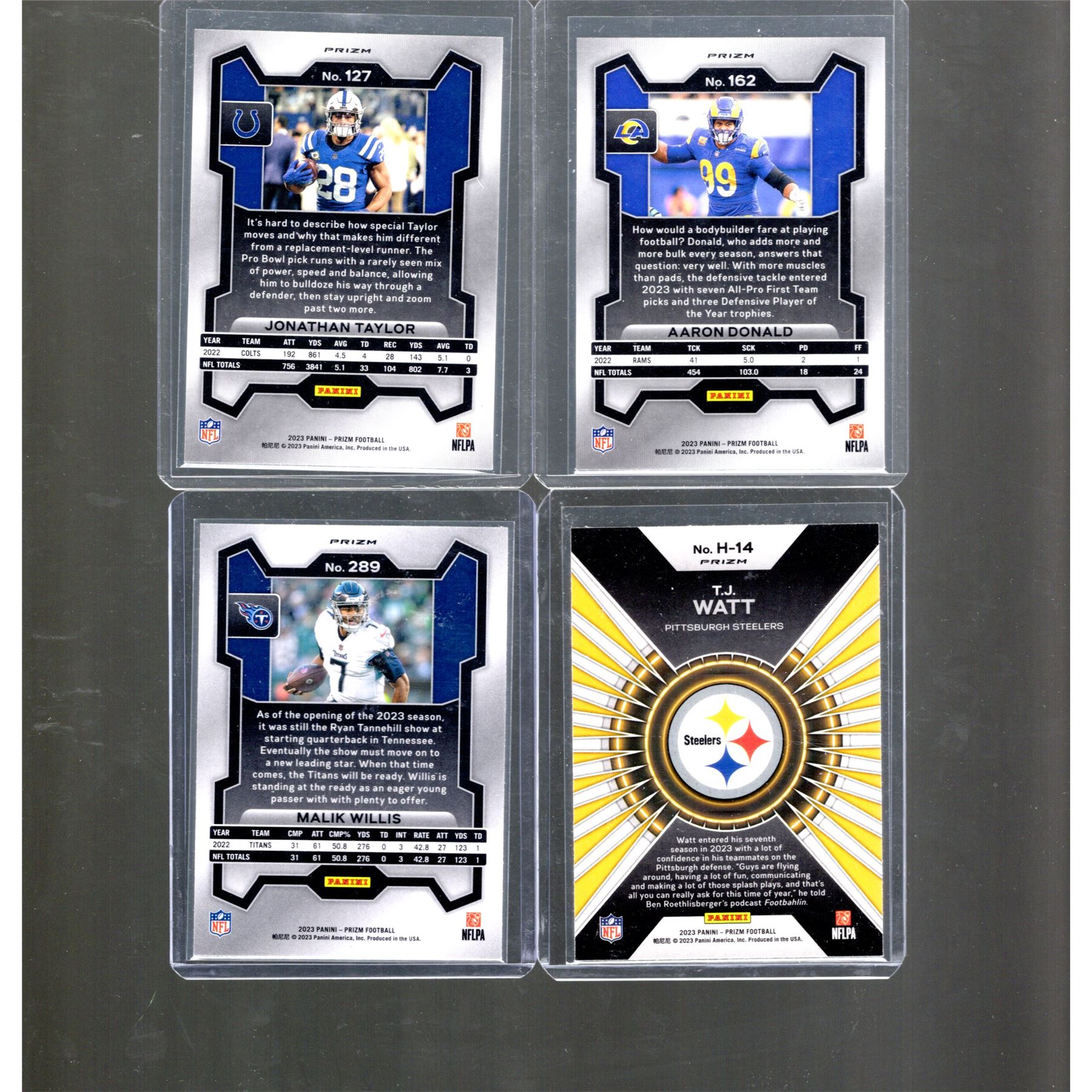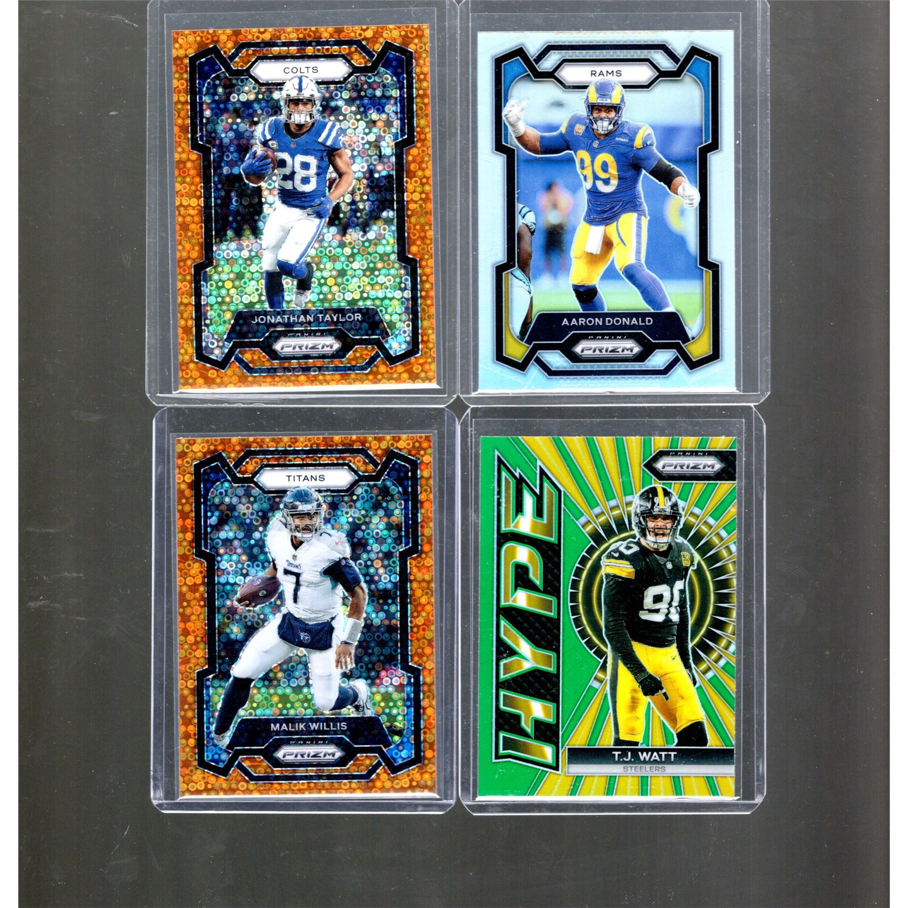 4 - 2023 Panini Prizm Inserts. Taylor Orange Disco, Aaron Donald Silver Prizm, Tj Watt Green Prizm Hype, Malik Willis Orange Disco