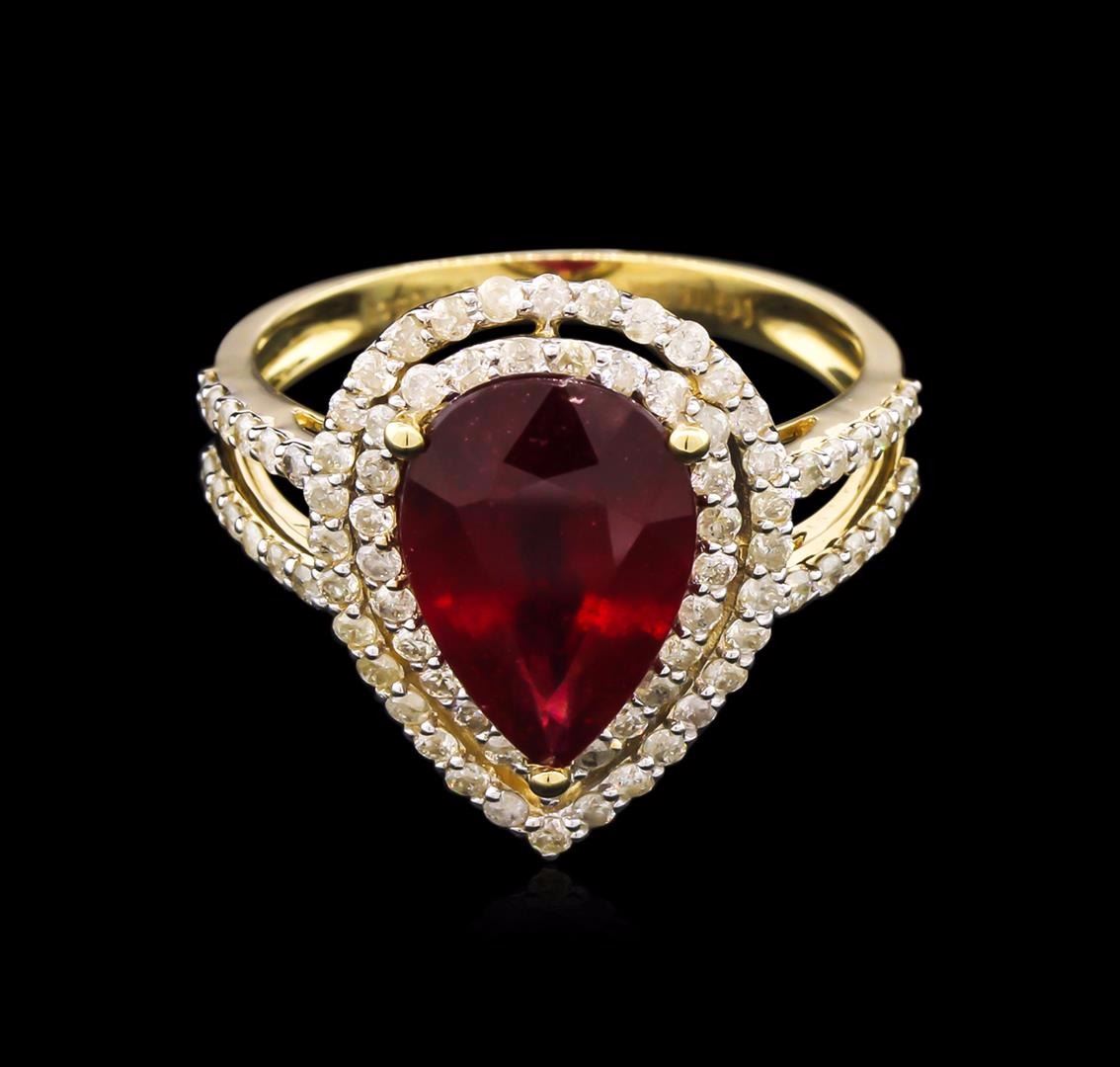 Fourteen karat (14) yellow gold ruby and diamond ring. A pear cut ruby corundum gemstone is prong mounted in the center of the ring. Round brilliant cut diamonds accent the ring around the center gemstone and on both sides. The ring is cast stamped "14K" and has a gross weight of 3.9 Grams. Diamond(s): Shape: Round Brilliant cut. Weight: 0.85 carat. Average Clarity: I1-2. Average Color: H-J. Symmetry: Very Good. Polish: Very Good. Gemstone(s): Gemstone: Ruby Corundum. Nature: Natural. Shape: Pear, Faceted. Quantity: 1, Mounted. Weight: 4.20 carat. Dimensions: Length- 12.68 mm. ; Width- 8.56mm. Bulge: Visible. Clarity: I1, Type 2. Color: Red (5/5). Symmetry: Very Good. Color Intensity: Medium. Transparency: Transparent. Tone: Dark. Enhancements: Indications of high temperature heat treatment, with glass and flux additives. Metal(s): Metal: Gold, Stamped. Purity: 14K. Color: Yellow. Condition: Excellent. Finish: High polish. GGA Appraised at $3,225.00.