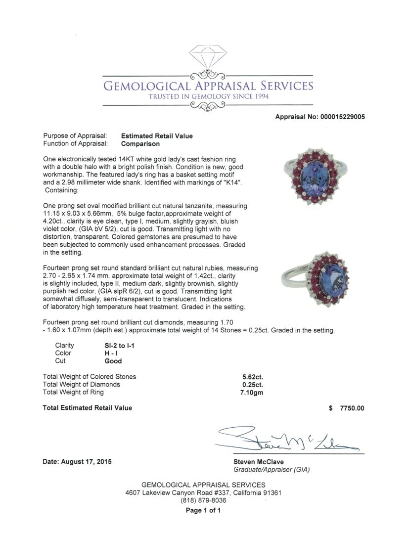 One electronically tested 14KT white gold lady's cast fashion ring with a double halo with a bright polish finish. The featured lady's ring has a basket setting motif and a 2.98 millimeter wide shank. Identified with markings of "K14". Condition is new, good workmanship. Containing: One prong set oval modified brilliant cut natural tanzanite, measuring 11.15 x 9.03 x 5.66mm, 5% bulge factor, approximate weight of 4.20ct., clarity is eye clean, type I, medium, slightly grayish, bluish violet color, (GIA bV 5/2), cut is good. Transmitting light with no distortion, transparent. Colored gemstones are presumed to have been subjected to commonly used enhancement processes. Graded in the setting. Fourteen prong set round standard brilliant cut natural rubies, measuring 2.70 - 2.65 x 1.74 mm, approximate total weight of 1.42ct., clarity is slightly included, type II, medium dark, slightly brownish, slightly purplish red color, (GIA slpR 6/2), cut is good. Transmitting light somewhat diffusely, semi-transparent to translucent. Indications of laboratory high temperature heat treatment. Graded in the setting. Fourteen prong set round brilliant cut diamonds, measuring 1.70 - 1.60 x 1.07mm (depth est.) approximate total weight of 14 Stones = 0.25ct. Graded in the setting. Clarity: SI-2 to I-1. Color: H - I. Cut Good. Total Weight of Colored Stones 5.62ct. Total Weight of Diamonds 0.25ct. Total Weight of Ring 7.10gm. GAS Appraised at $7,750.00.