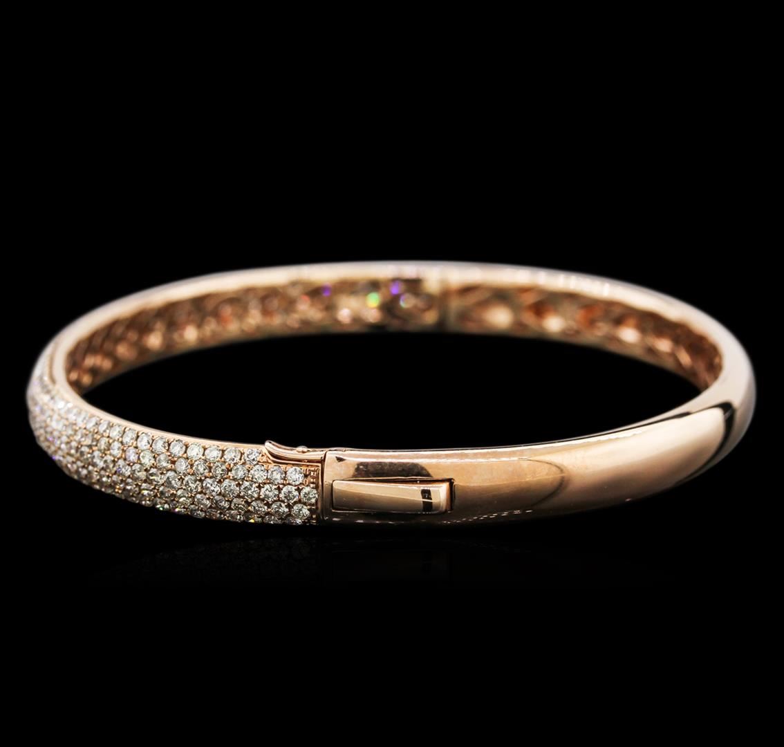One electronically tested 14KT rose gold lady's combination cast & assembled fashion bangle bracelet with a tongue clasp with foldover safety with a bright polish finish. The featured lady's bangle bracelet has five rows of diamonds and an internal circumference of 7 inches with a width of 6.5 millimeters. Condition is new, good workmanship. Containing: Two Hundred Ninety-Four prong set round brilliant cut diamonds, measuring 1.60 - 1.50 x 0.98mm (depth est.) approximate total weight of 294 Stones = 4.21ct. Graded in the setting. Clarity: VS-2 to SI-2. Color: G - I. Cut Very Good. Total Weight of Diamonds 4.21ct. Total Weight of Bangle Bracelet 19.30gm. GAS Appraised at $15,385.00.