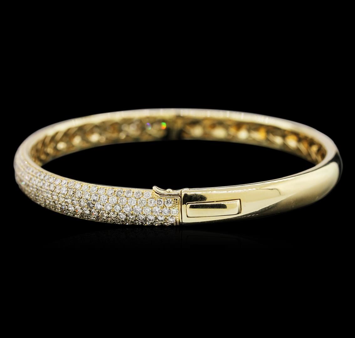 One 14KT yellow gold lady's combination cast & assembled fashion bangle bracelet with a tongue clasp with foldover safety with a bright polish finish. The featured lady's bangle bracelet has five rows of diamonds and an internal circumference of 7 inches with a 6.5 millimeter width. Condition is new, good workmanship. Containing: Two Hundred Ninety-Four prong set round brilliant cut diamonds, measuring 1.60 - 1.50 x 0.98mm (depth est.) approximate total weight of 294 Stones = 4.21ct. Graded in the setting. Clarity: VS-2 to SI-1. Color: H - I. Cut Very Good. Total Weight of Diamonds 4.21ct. Total Weight of Bangle Bracelet 18.80gm. GAS Appraised at $15,315.00.
