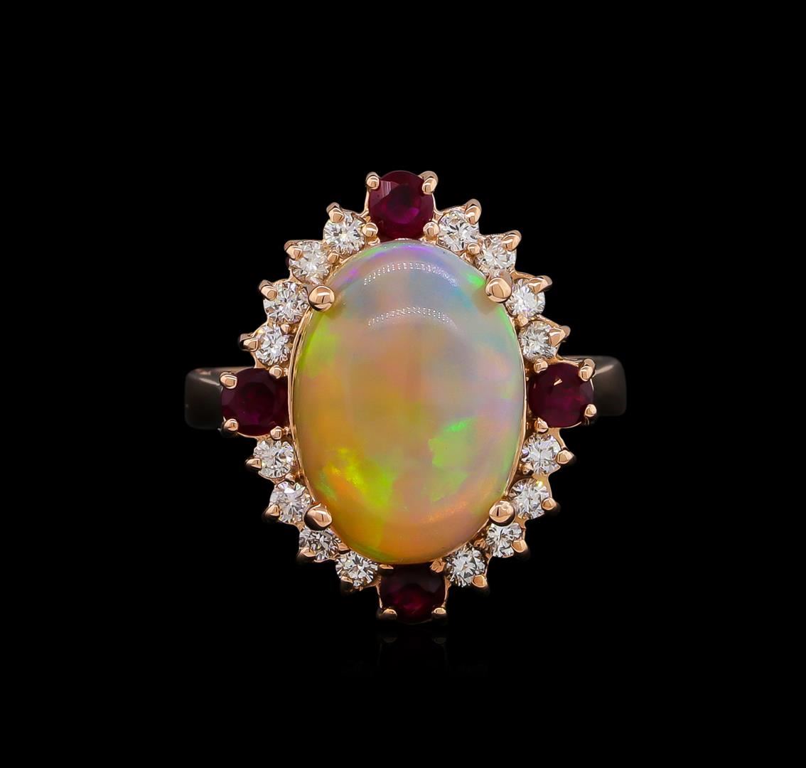 One ring featuring: 14KT rose gold weighing 5.68 grams containing one opal with a total weight of 3.71ct and four rubies with a total weight of 0.50ct and side diamonds with a total weight of 0.40ct.