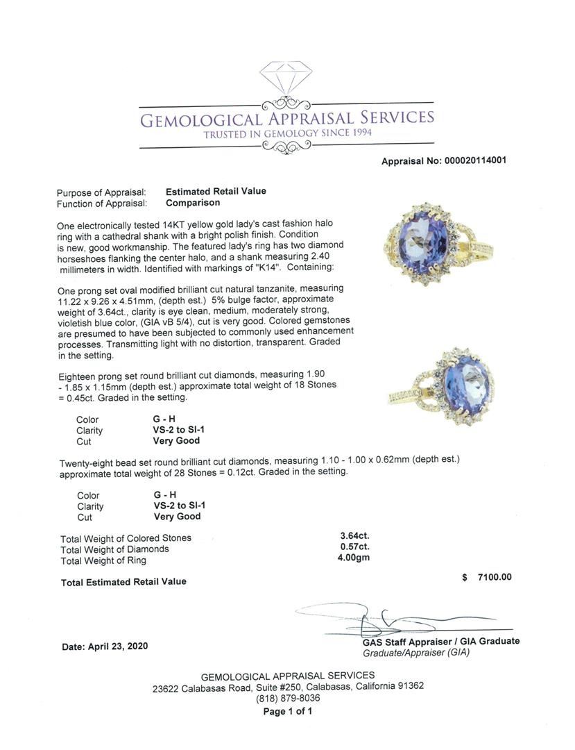 One electronically tested 14KT yellow gold lady's cast fashion halo ring with a cathedral shank with a bright polish finish. The featured lady's ring has two diamond horseshoes flanking the center halo, and a shank measuring 2.40 millimeters in width. Identified with markings of 'K14'. Condition is new, good workmanship. Containing: One prong set oval modified brilliant cut natural tanzanite, measuring 11.22 x 9.26 x 4.51mm, (depth est.) 5%. bulge factor, approximate weight of 3.64ct., clarity is eye clean, medium, moderately strong, violetish blue color, (GIA vB 5/4), cut is very good. Colored gemstones are presumed to have been subjected to commonly used enhancement processes. Transmitting light with no distortion, transparent. Graded in the setting. Eighteen prong set round brilliant cut diamonds, measuring 1.90 - 1.85 x 1.15mm (depth est.) approximate total weight of 18 Stones = 0.45ct. Graded in the setting. Color G - H Clarity VS-2 to SI-1 Cut Very Good Twenty-Eight bead set round brilliant cut diamonds, measuring 1.10 - 1.00 x 0.62mm (depth est.) approximate total weight of 28 Stones = 0.12ct. Graded in the setting. Color G - H Clarity VS-2 to SI-1 Cut Very Good. Total Weight of Colored Stones 3.64ct.. Total Weight of Diamonds 0.57ct.. Total Weight of Ring 4.00gm GAS Appraised at $7100.00. GAS Appraised.