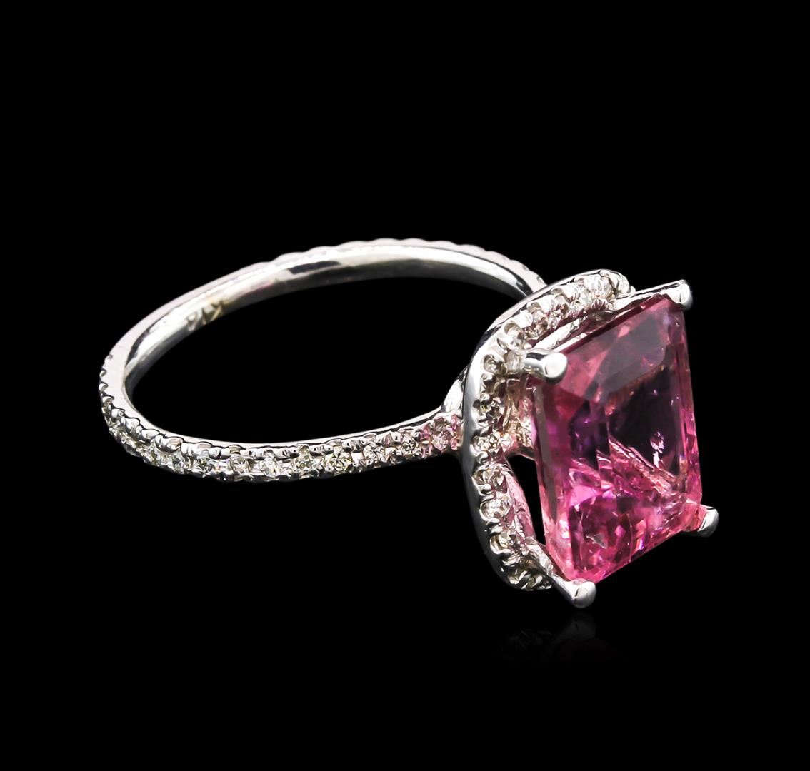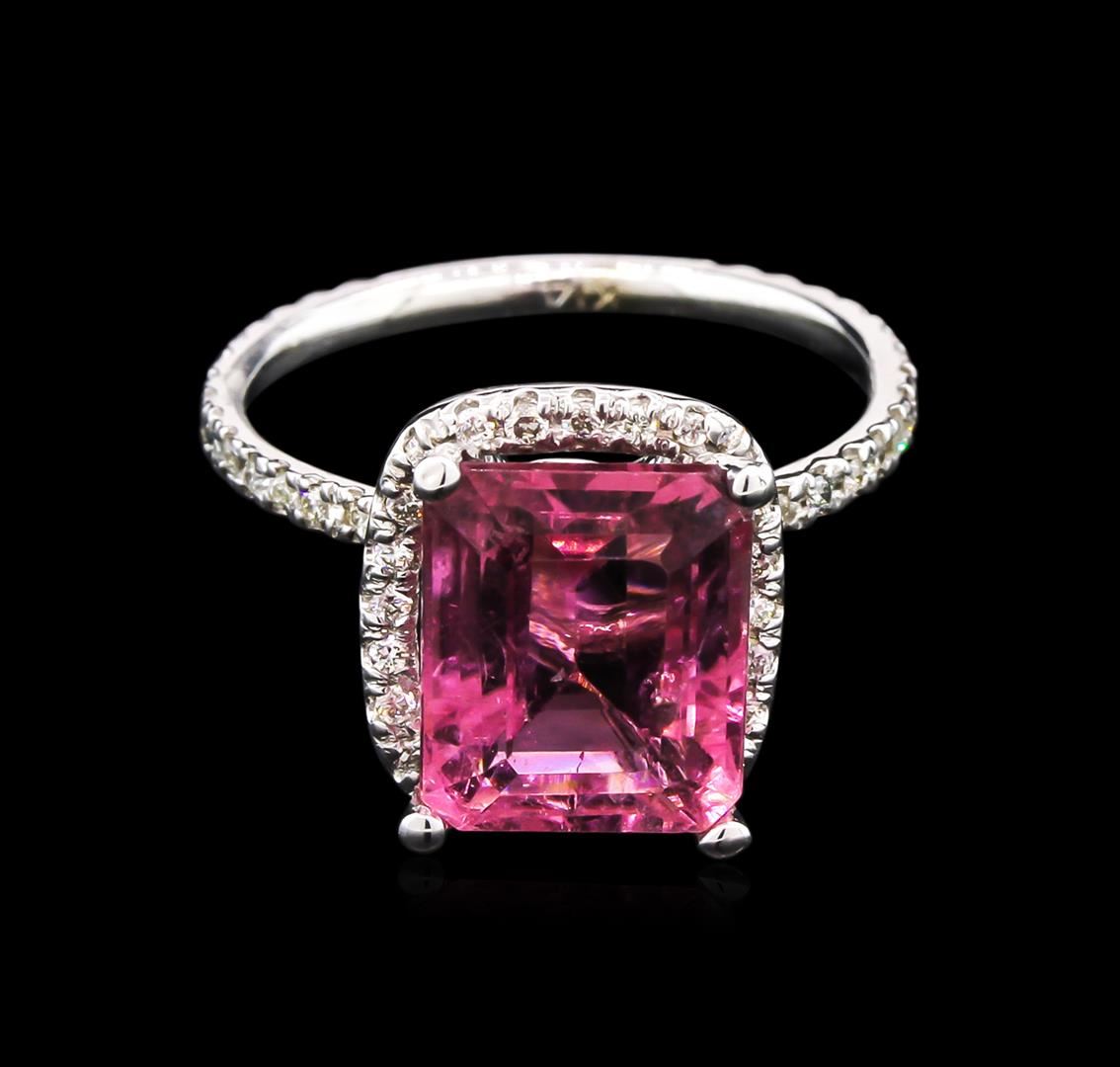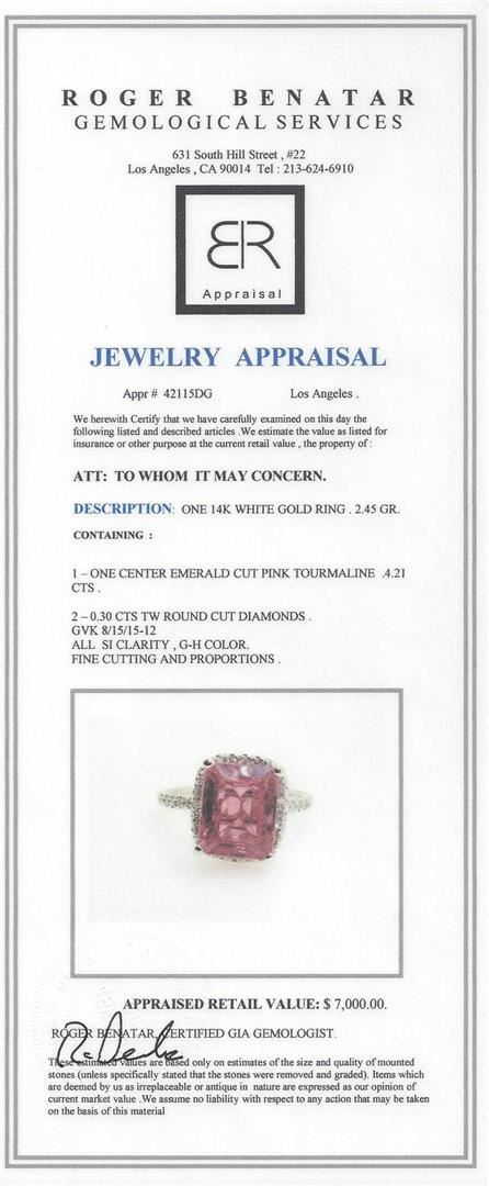 One 14KT white gold ring weighing 2.45 grams containing: 1 center emerald cut pink tourmaline with a total approximate weight of 4.21ct and round cut diamonds with a total approximate weight of 0.30ct. Diamonds: All SI clarity; G-H color. Fine cutting/proportions. RBGS Appraised at $7,000.00.