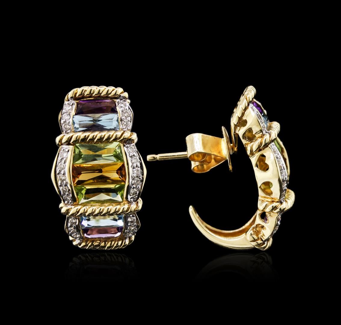 One Pair 14KT Yellow Gold Multi Gemstone and Diamond Earrings: 14 Multi Color Gemstones: Carat Weight: 4.21cts. Clarity: Eye Clean. Color: Purple, Yellow, Blue and Green. Type: Amethyst, Citrine, Blue Topaz and Peridot. 44 Round Brilliant Diamonds: Carat Weight: 0.26cts. Clarity: SI-2 to I-1. Color: G - I. Total Weight of Gemstone: 4.47cts and Total Weight of Item: 7.24gm. AIG Appraised at $2,190.00.