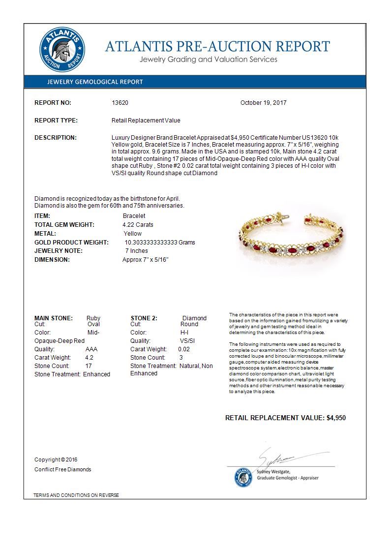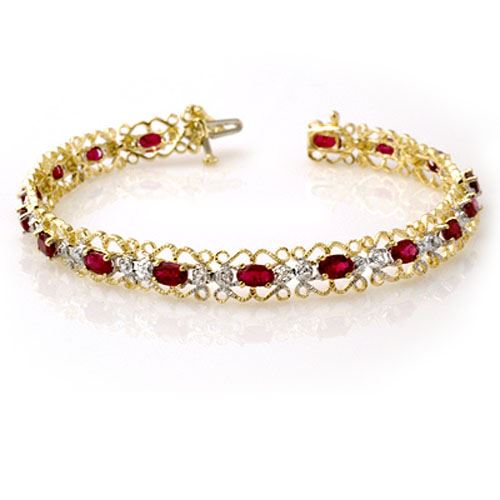 REF-69T3M -13620 ---- 4.22 CTW Ruby & Diamond Bracelet 10K Yellow Gold ---- Luxury Designer Brand Bracelet Appraised at $4,950 Certificate Number US13620 10k Yellow gold, Bracelet Size is 7 Inches, Bracelet measuring approx. 7" x 5/16", weighing in total approx. 9.6 grams. Made in the USA and is stamped 10k, Main stone 4.2 carat total weight containing 17 pieces of Mid-Opaque-Deep Red color with AAA quality Oval shape cut Ruby , Stone #2 0.02 carat total weight containing 3 pieces of H-I color with VS/SI quality Round shape cut Diamond