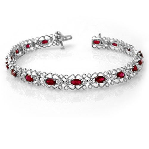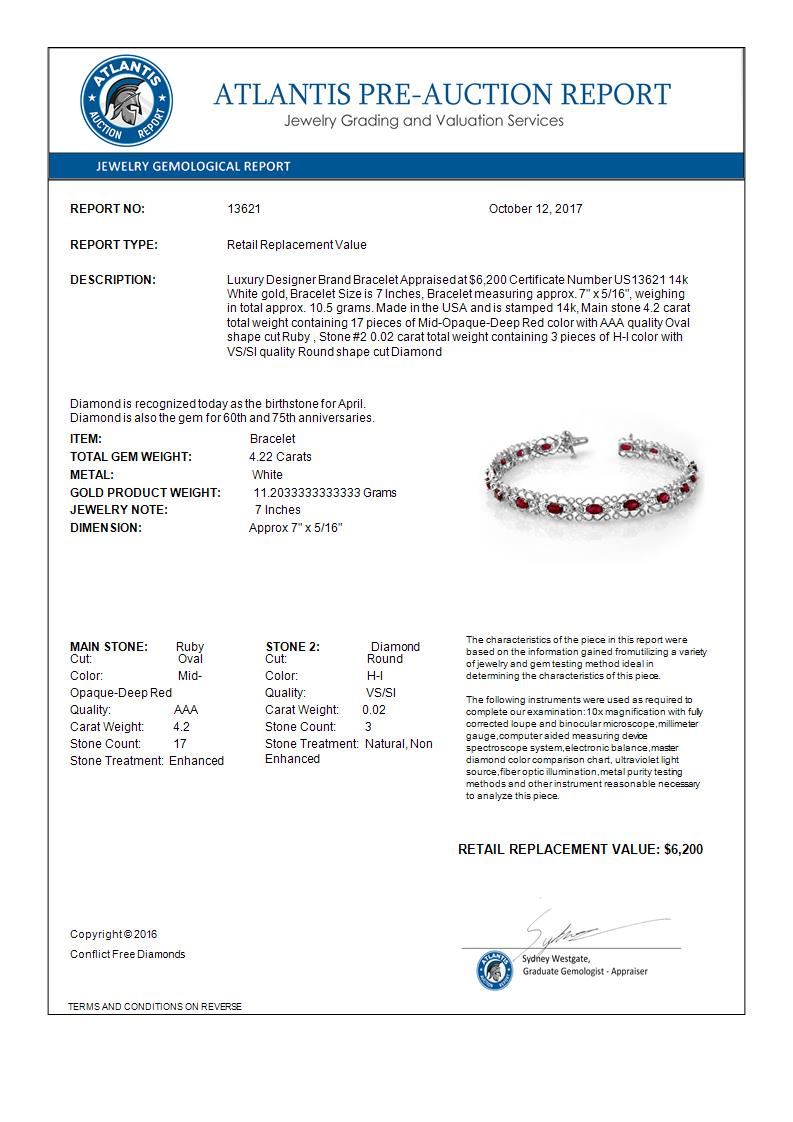 13621 - REF-86W9H ---- 4.22 CTW Ruby & Diamond Bracelet 14K White Gold ---- Luxury Designer Brand Bracelet Appraised at $6,200 Certificate Number US13621 14k White gold, Bracelet Size is 7 Inches, Bracelet measuring approx. 7" x 5/16", weighing in total approx. 10.5 grams. Made in the USA and is stamped 14k, Main stone 4.2 carat total weight containing 17 pieces of Mid-Opaque-Deep Red color with AAA quality Oval shape cut Ruby , Stone #2 0.02 carat total weight containing 3 pieces of H-I color with VS/SI quality Round shape cut Diamond