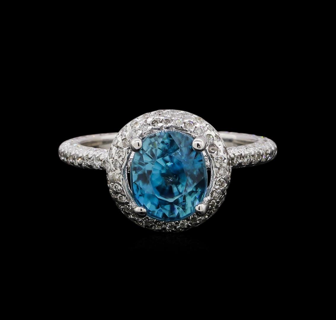 One electronically tested 14KT white gold ladies cast blue zircon and diamond ring with a bright polish finish. The featured blue zircon is set within a diamond bezel supported by a diamond under gallery and diamond set shoulders, completed by a two millimeter wide diamond set band. Identified with markings of '14K'. Condition is new, good workmanship. Containing: One prong set oval mixed cut natural blue zircon, measuring 8.55 x 7.10 x 6.60mm, 7%. bulge factor, approximate weight of 4.23ct., clarity is slightly included, type I, medium, moderately strong, very strongly greenish blue color, (GIA vstgB 5/4), cut is good. Transmitting light with no distortion, transparent. Graded in the setting. One Hundred Thirty-One prong set round brilliant cut diamonds, measuring 1.30 - 1.20 x 0.75mm (depth est.) approximate total weight of 131 Stones = 0.99ct. The clarity grade reflects the entire range of clarity for this group. Graded in the setting. Clarity SI-1 to I-2. Color: F - H Sixty-Eight prong set round brilliant cut diamonds, measuring 1.10 - 0.90 x 0.60mm (depth est.) approximate total weight of 68 Stones = 0.28ct. Graded in the setting. Clarity SI-2 to I-2. Color: F - H. Total Weight of Colored Stones 4.23ct.. Total Weight of Diamonds 1.27ct.. Total Weight of Ring 3.62gm. AIG Appraised at $6,885.00.
