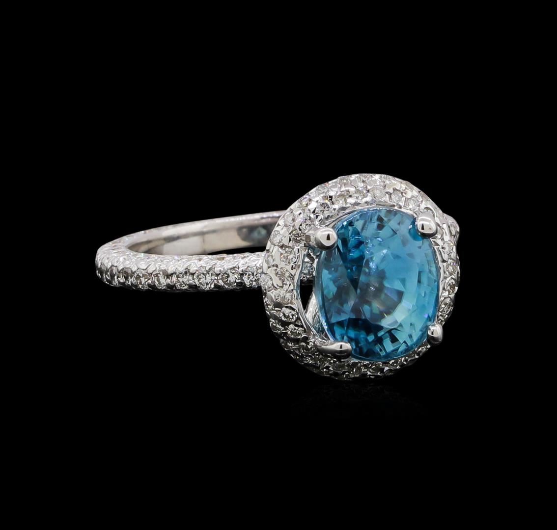 One electronically tested 14KT white gold ladies cast blue zircon and diamond ring with a bright polish finish. The featured blue zircon is set within a diamond bezel supported by a diamond under gallery and diamond set shoulders, completed by a two millimeter wide diamond set band. Identified with markings of '14K'. Condition is new, good workmanship. Containing: One prong set oval mixed cut natural blue zircon, measuring 8.55 x 7.10 x 6.60mm, 7%. bulge factor, approximate weight of 4.23ct., clarity is slightly included, type I, medium, moderately strong, very strongly greenish blue color, (GIA vstgB 5/4), cut is good. Transmitting light with no distortion, transparent. Graded in the setting. One Hundred Thirty-One prong set round brilliant cut diamonds, measuring 1.30 - 1.20 x 0.75mm (depth est.) approximate total weight of 131 Stones = 0.99ct. The clarity grade reflects the entire range of clarity for this group. Graded in the setting. Clarity SI-1 to I-2. Color: F - H Sixty-Eight prong set round brilliant cut diamonds, measuring 1.10 - 0.90 x 0.60mm (depth est.) approximate total weight of 68 Stones = 0.28ct. Graded in the setting. Clarity SI-2 to I-2. Color: F - H. Total Weight of Colored Stones 4.23ct.. Total Weight of Diamonds 1.27ct.. Total Weight of Ring 3.62gm. AIG Appraised at $6,885.00.