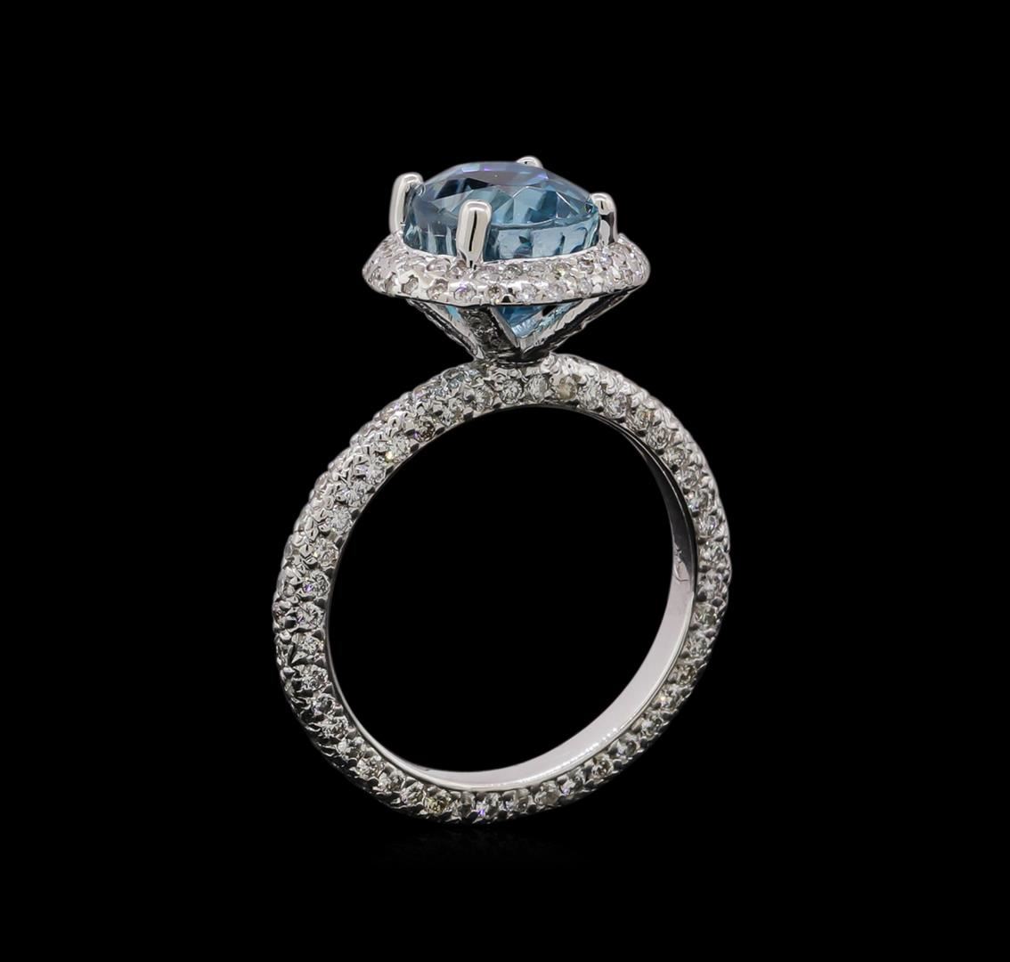 One electronically tested 14KT white gold ladies cast blue zircon and diamond ring with a bright polish finish. The featured blue zircon is set within a diamond bezel supported by a diamond under gallery and diamond set shoulders, completed by a two millimeter wide diamond set band. Identified with markings of '14K'. Condition is new, good workmanship. Containing: One prong set oval mixed cut natural blue zircon, measuring 8.55 x 7.10 x 6.60mm, 7%. bulge factor, approximate weight of 4.23ct., clarity is slightly included, type I, medium, moderately strong, very strongly greenish blue color, (GIA vstgB 5/4), cut is good. Transmitting light with no distortion, transparent. Graded in the setting. One Hundred Thirty-One prong set round brilliant cut diamonds, measuring 1.30 - 1.20 x 0.75mm (depth est.) approximate total weight of 131 Stones = 0.99ct. The clarity grade reflects the entire range of clarity for this group. Graded in the setting. Clarity SI-1 to I-2. Color: F - H Sixty-Eight prong set round brilliant cut diamonds, measuring 1.10 - 0.90 x 0.60mm (depth est.) approximate total weight of 68 Stones = 0.28ct. Graded in the setting. Clarity SI-2 to I-2. Color: F - H. Total Weight of Colored Stones 4.23ct.. Total Weight of Diamonds 1.27ct.. Total Weight of Ring 3.62gm. AIG Appraised at $6,885.00.