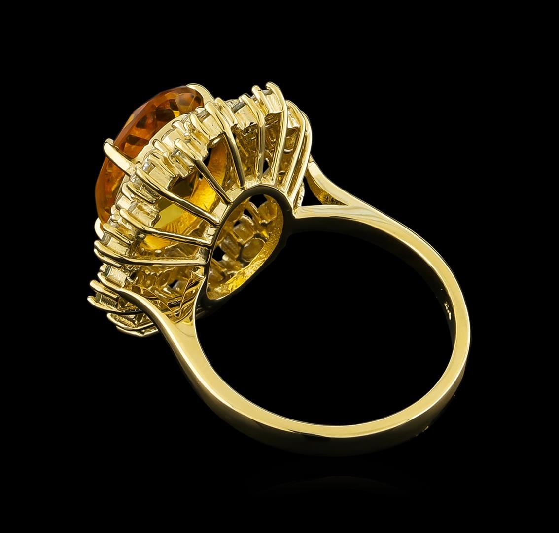 One electronically tested 14KT yellow gold lady's cast fashion ring with a double basket halo with a bright polish finish. The featured lady's ring has a shank measuring 2.79 millimeters wide. Identified with markings of "K14". Condition is new, good workmanship. Containing: One prong set oval modified brilliant cut natural citrine quartz, measuring 14.04 x 9.86 x 5.59mm, approximate weight of 4.23ct., clarity is eye clean, type I, medium dark, moderately strong, yellowish orange color, (GIA yO 6/4), cut is good. Transmitting light with no distortion, transparent. Colored gemstones are presumed to have been subjected to commonly used enhancement processes. Graded in the setting. Ten prong set round brilliant cut diamonds, measuring 2.40 - 2.30 x 1.43mm (depth est.) approximate total weight of 10 Stones = 0.48ct. Graded in the setting. Clarity: SI-1 to SI-2. Color: H - I. Cut Good Thirty-Four prong set round brilliant cut diamonds, measuring 1.70 - 1.60 x 1.02mm (depth est.) approximate total weight of 34 Stones = 0.58ct. Graded in the setting. Clarity: SI-1 to SI-2. Color: H - I. Cut Very Good. Total Weight of Colored Stones 4.23ct. Total Weight of Diamonds 1.06ct. Total Weight of Ring 7.00gm GAS Appraised at $3,585.00.