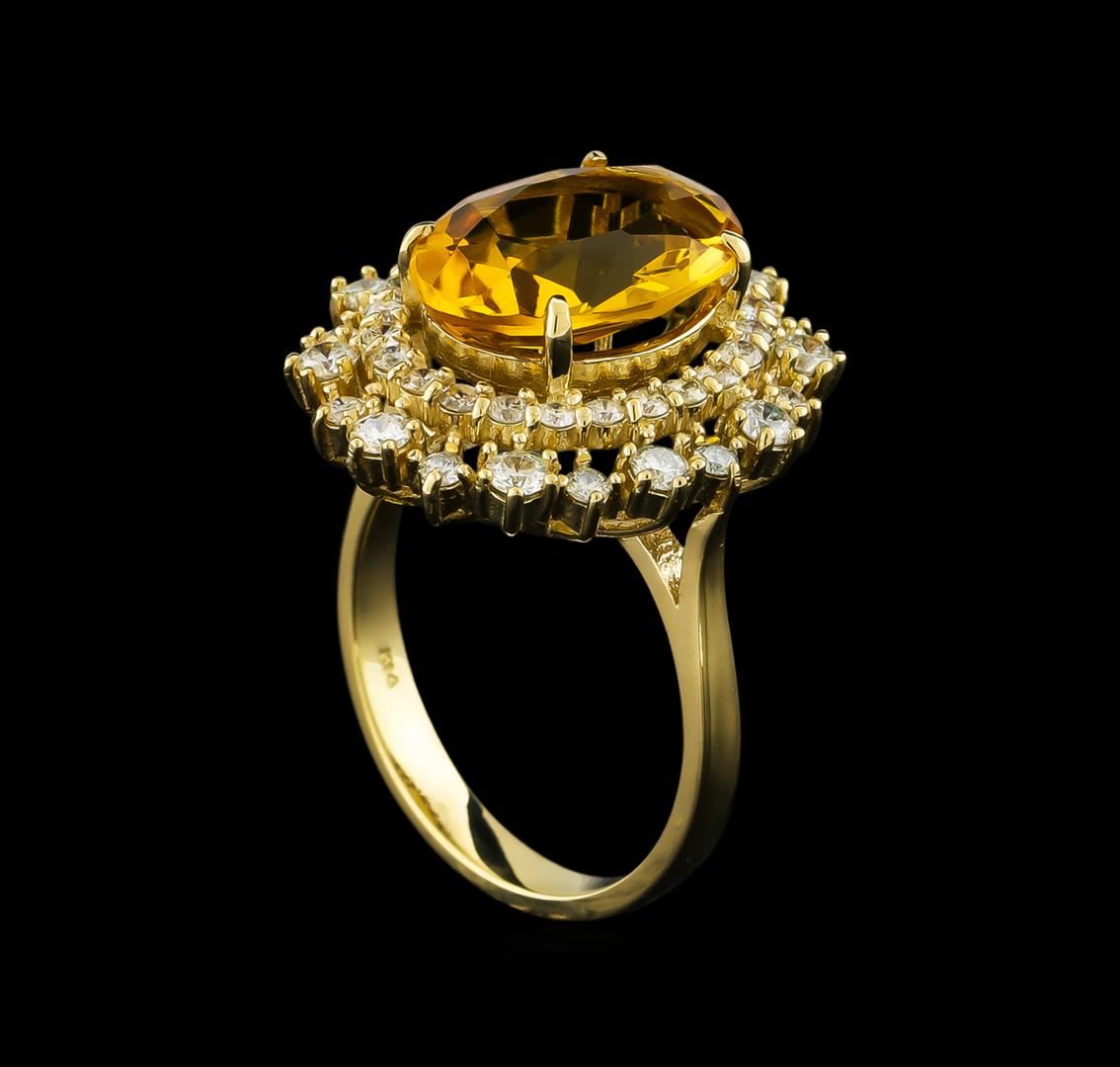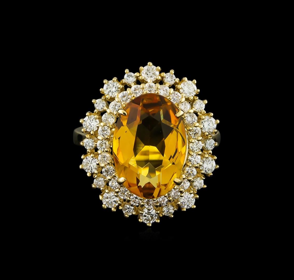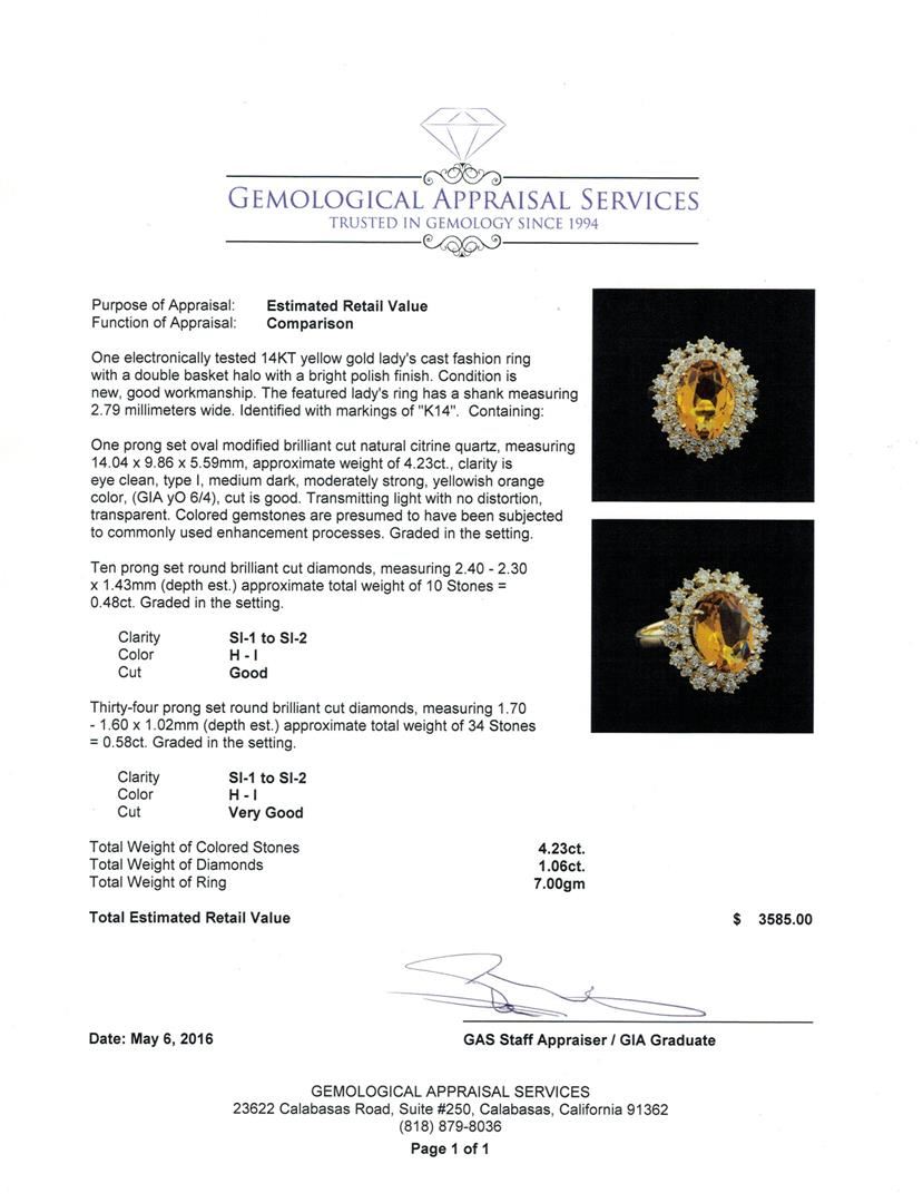 One electronically tested 14KT yellow gold lady's cast fashion ring with a double basket halo with a bright polish finish. The featured lady's ring has a shank measuring 2.79 millimeters wide. Identified with markings of "K14". Condition is new, good workmanship. Containing: One prong set oval modified brilliant cut natural citrine quartz, measuring 14.04 x 9.86 x 5.59mm, approximate weight of 4.23ct., clarity is eye clean, type I, medium dark, moderately strong, yellowish orange color, (GIA yO 6/4), cut is good. Transmitting light with no distortion, transparent. Colored gemstones are presumed to have been subjected to commonly used enhancement processes. Graded in the setting. Ten prong set round brilliant cut diamonds, measuring 2.40 - 2.30 x 1.43mm (depth est.) approximate total weight of 10 Stones = 0.48ct. Graded in the setting. Clarity: SI-1 to SI-2. Color: H - I. Cut Good Thirty-Four prong set round brilliant cut diamonds, measuring 1.70 - 1.60 x 1.02mm (depth est.) approximate total weight of 34 Stones = 0.58ct. Graded in the setting. Clarity: SI-1 to SI-2. Color: H - I. Cut Very Good. Total Weight of Colored Stones 4.23ct. Total Weight of Diamonds 1.06ct. Total Weight of Ring 7.00gm GAS Appraised.