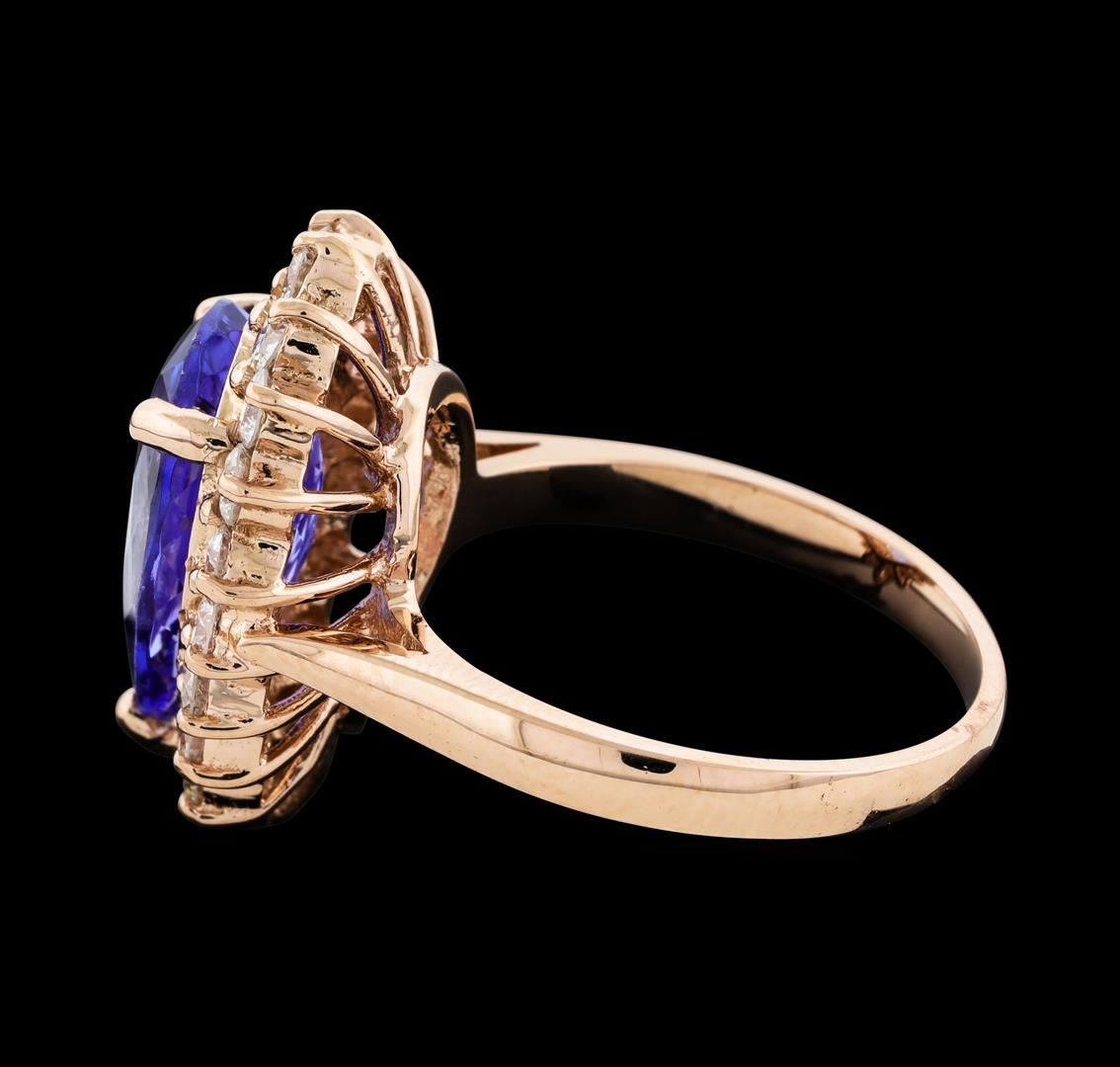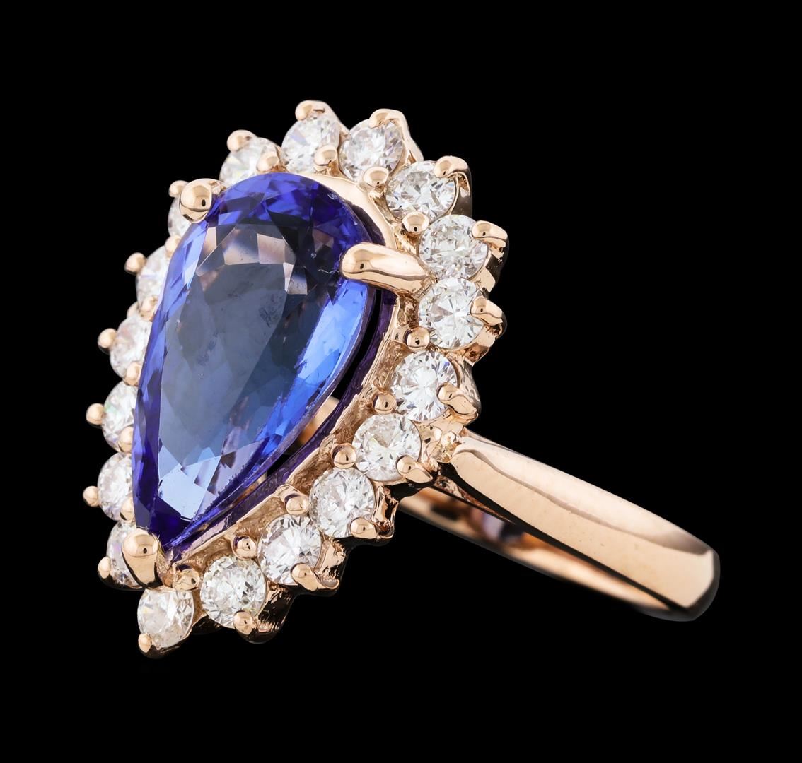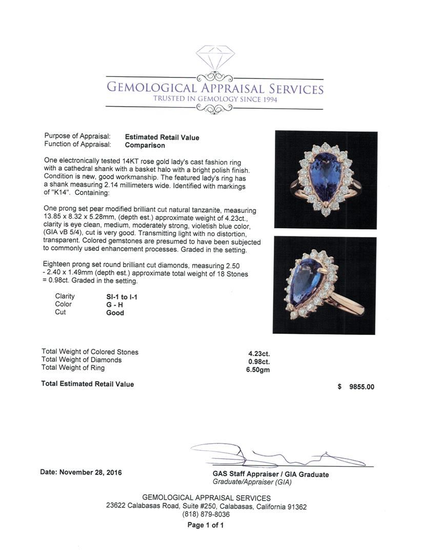 One electronically tested 14KT rose gold lady's cast fashion ring with a cathedral shank with a basket halo with a bright polish finish. The featured lady's ring has a shank measuring 2.14 millimeters wide. Identified with markings of 'K14'. Condition is new, good workmanship. Containing: One prong set pear modified brilliant cut natural tanzanite, measuring 13.85 x 8.32 x 5.28mm, (depth est.) approximate weight of 4.23ct., clarity is eye clean, medium, moderately strong, violetish blue color, (GIA vB 5/4), cut is very good. Transmitting light with no distortion, transparent. Colored gemstones are presumed to have been subjected to commonly used enhancement processes. Graded in the setting. Eighteen prong set round brilliant cut diamonds, measuring 2.50 - 2.40 x 1.49mm (depth est.) approximate total weight of 18 Stones = 0.98ct. Graded in the setting. Clarity SI-1 to I-1. Color: G - H Cut Good. Total Weight of Colored Stones 4.23ct.. Total Weight of Diamonds 0.98ct.. Total Weight of Ring 6.50gm. GAS Appraised at $9,855.00.