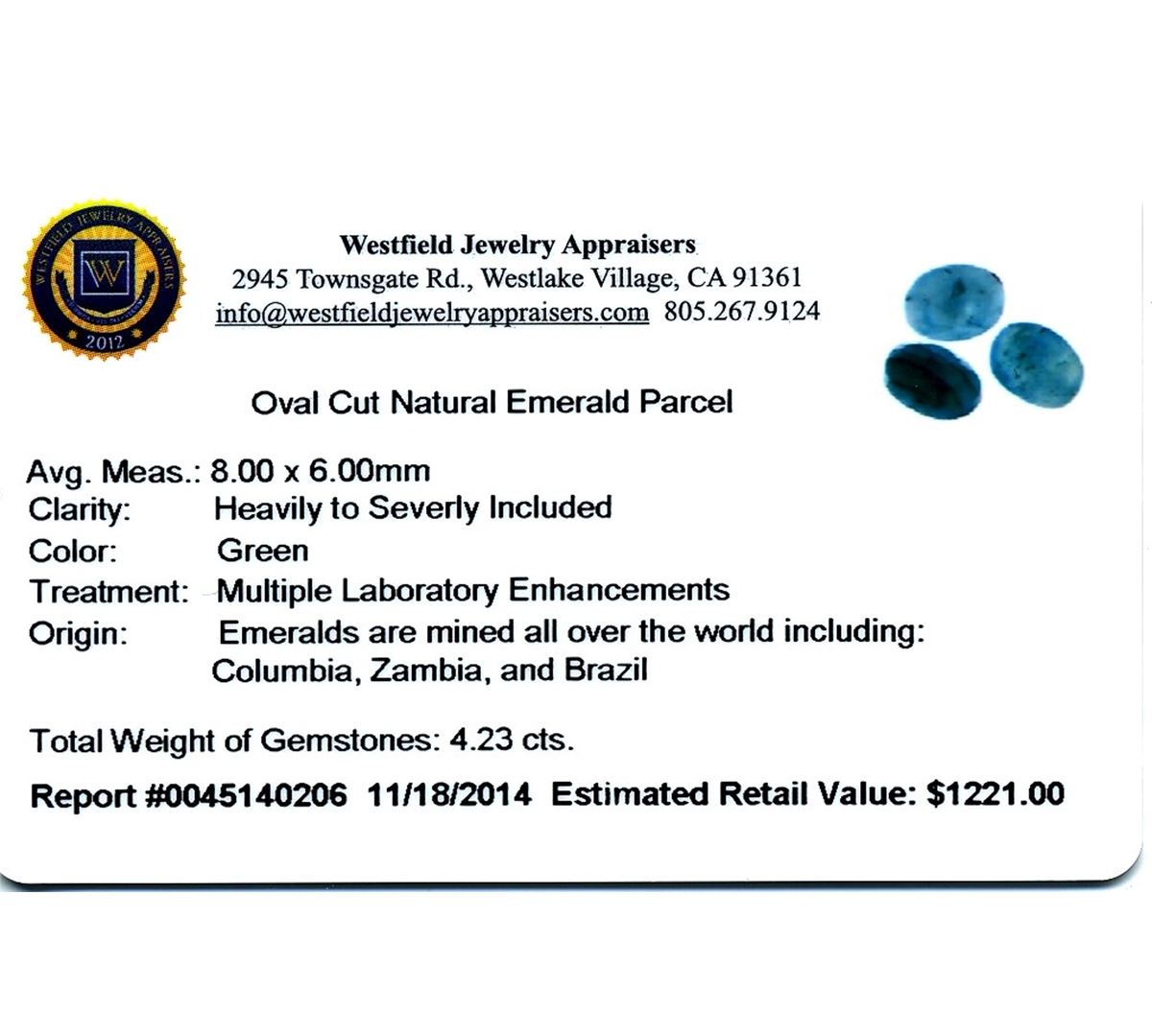 4.23cts. Oval Cut Natural Emerald Parcel Westfield Appraised at $1,221.00.
